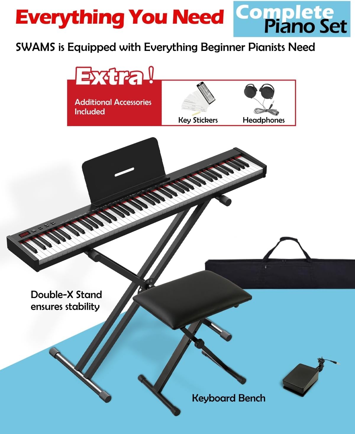 NikoMaku Piano Keyboard 88 Keys with Bench and Stand, Semi weighted Portable Digital Piano for Beginners, SWAN-S White, with Headphones, Stickers, Carrying Case