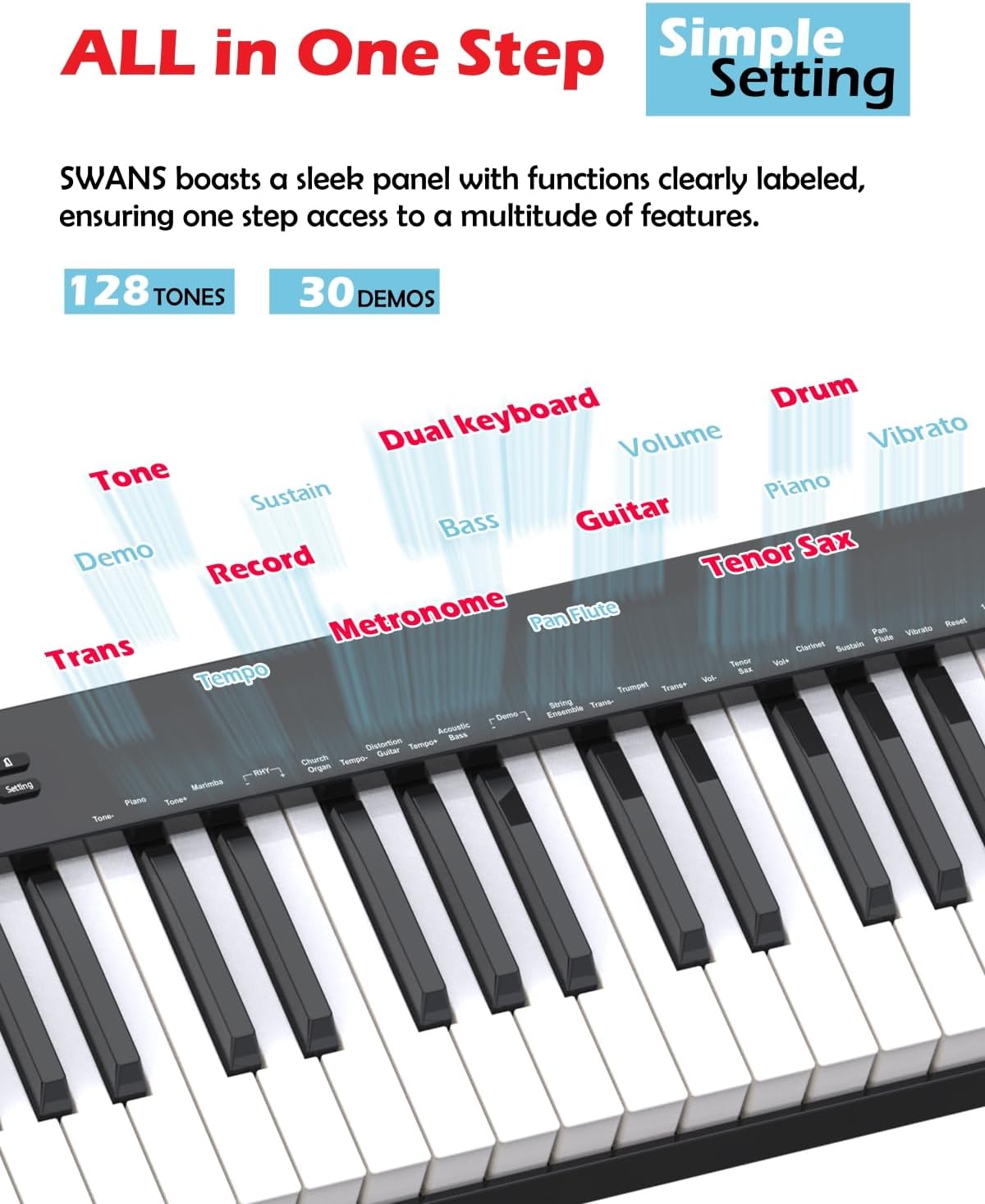 【Portable & Compact Design】 Weighing only 10.8 lbs and measuring 48.25" x 8.27", the SWAN-S digital piano is lightweight and space-saving—perfect for small rooms, travel, or classroom use. Easy to carry, no burden.
