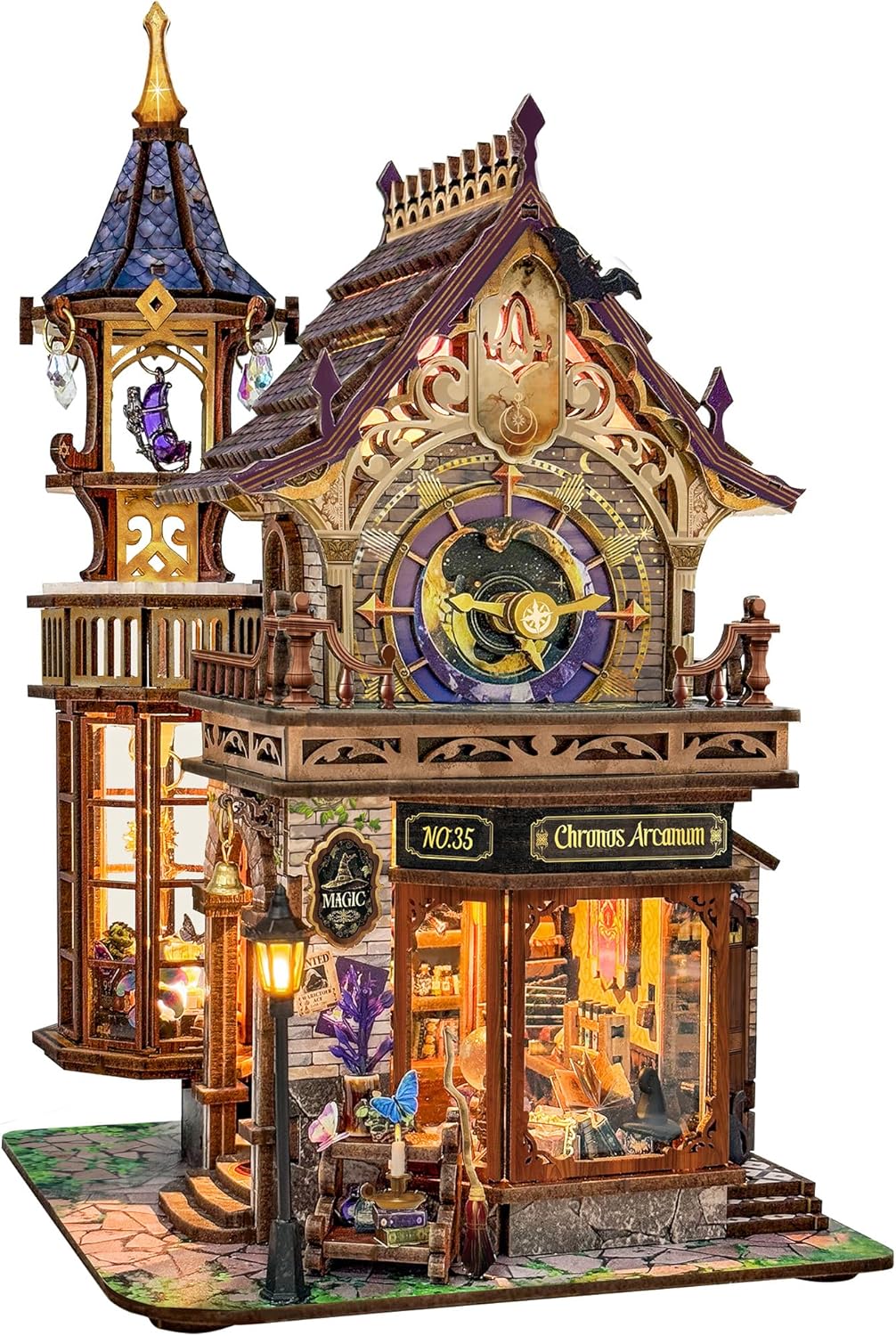 Time Magic Club: A magical miniature clock shop with intricate details, glowing lights, and enchanting decor. Step into a world of time and wonder