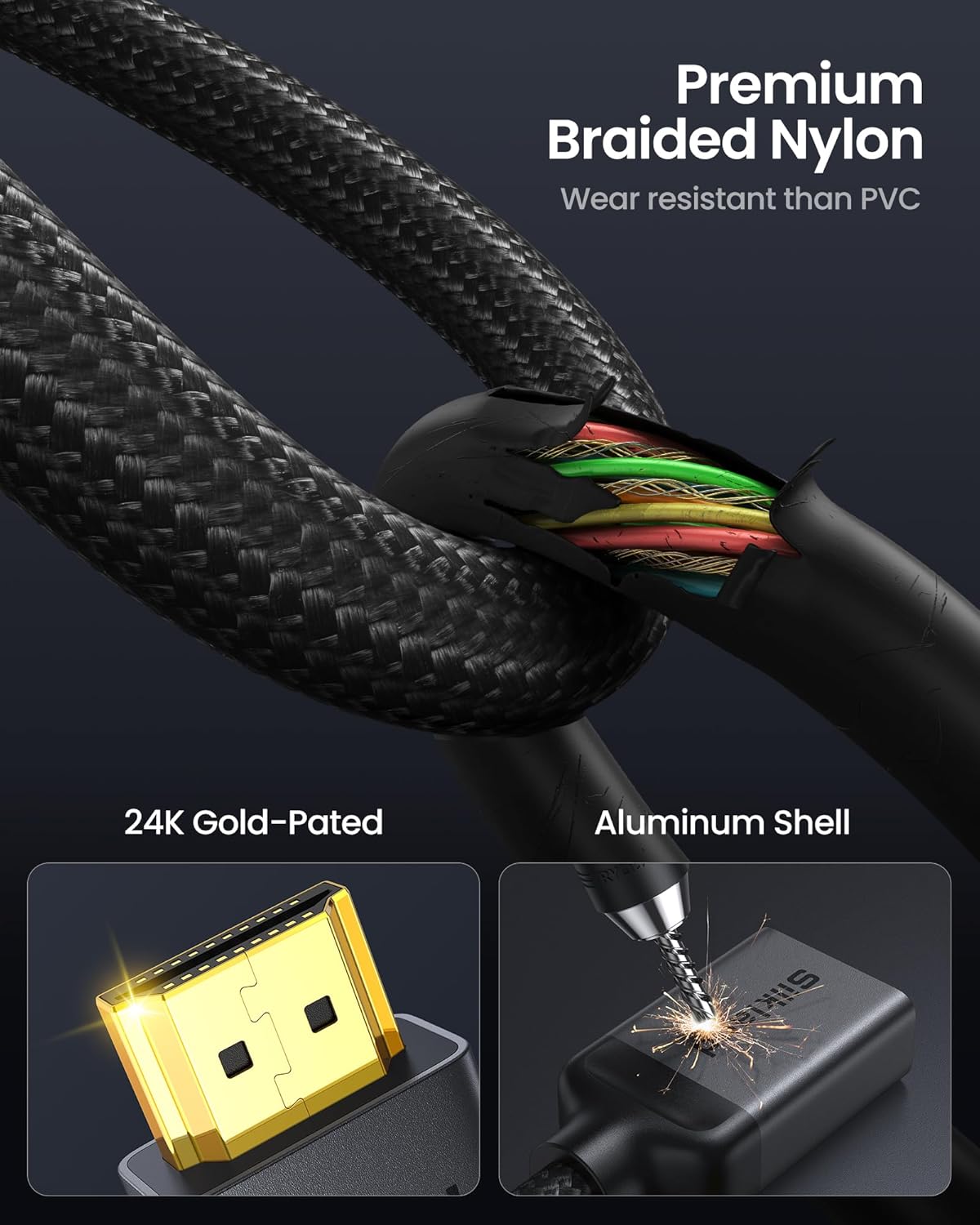 【Built to Last with Stable Signal】Nylon braiding and double-layer fishnet winding resist tangles and damage. 24K gold-plated connectors prevent corrosion, while triple shielding and 28AWG copper core eliminate interference for less screen flickering, or white dots, more flawless videos