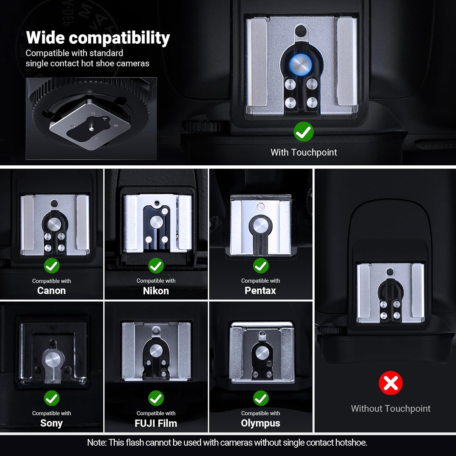 【Speedlight For Standard Hot Shoe Cameras】 The single contact hot shoe speedlite flash for external photography lighting accessories is compatible with Canon Nikon Panasonic Olympus Pentax Fuji DSLR, compatible with Sony MI hot shoe cameras zv e10 zv1 a7iii a7iv a7c a7rv a6100 Alpha a6400 a6700. Not compatible with Canon EOS Rebel SL3/250D Rebel T7/1500D 2000D Rebel T100/3000D 4000D 200DII R50, not compatible with Sony A9III A99 A77 A350 ZV-1F, not compatible with Fujifilm X-A3 X100F X100T