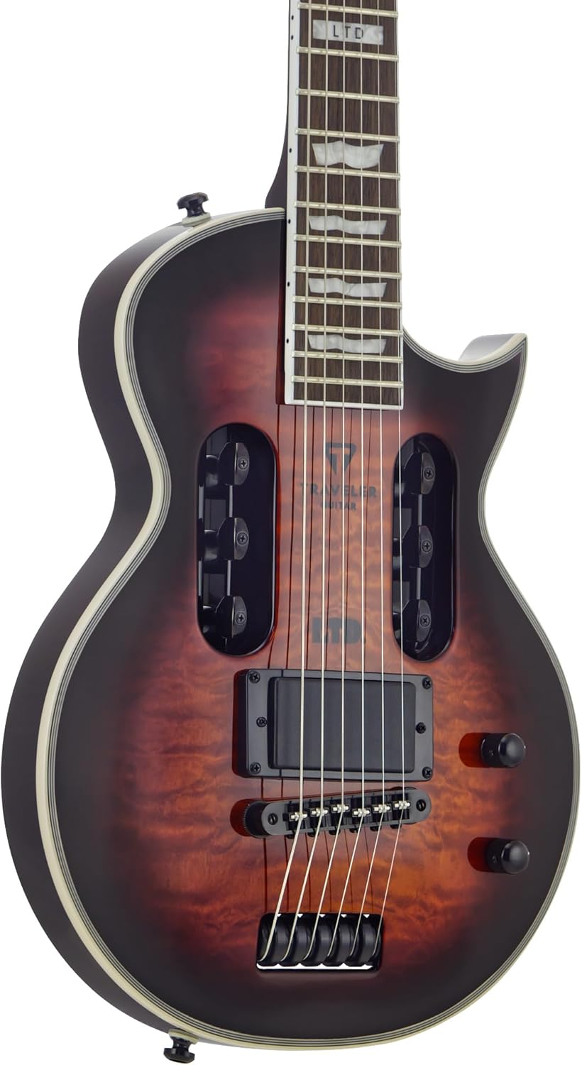 Meet the refreshed LTD EC-1 from Traveler Guitar: A no-compromise shred machine forged for the modern guitarist who needs full-scale feel and tone in a rig that’s made to move. Re-engineered for 2025 and now offered at an all-new, lower price, this axe is ready to melt faces without breaking your back—or your bank. HARD ROCK HERITAGE. LEGENDARY DNA. Officially licensed by ESP Guitars, the LTD EC-1 brings the iconic shape and aggressive spirit of the LTD EC series into a package that’s 24% shorter and 29% lighter than a standard guitar but still delivers full-scale power with a 24.75-inch playable neck. Weighing in at a mere 5 lbs 4 oz, this is the weapon of choice for road warriors, backstage rippers, and couch-bound riffers alike. BUILT TO RIP. READY TO RULE. Equipped with a searing ESP-designed ALH-200B active humbucker, the LTD EC-1 doesn’t just look mean—it sounds absolutely lethal. Crank up the volume and tone controls, and this beast screams with tight lows, cutting highs, and everything in between. Features: · Refreshed for 2025 with New Finishes and Lower Pricing: Updated with bold new looks and a more affordable price point, the 2025 LTD EC-1 delivers more style and value than ever. · Officially Licensed by ESP Guitars: This isn’t a copy—it’s the real deal. Designed in partnership with ESP, the LTD EC-1 delivers authentic LTD styling in a compact package. · New Colorways: Dark Brown Sunburst & See Thru Black Cherry with Quilted Tops: Two all-new finishes join the lineup; match your sound with your style. · Also Available in Snow White, Vintage Black Matte & Violet Shadow w/Quilted Top (Sweetwater Exclusive): From classic to aggressive to eye-catching, there's a finish to match your style. · Full 24.75-Inch Scale: Standard electric guitar scale length—no compromises in feel or playability. · 24% Shorter, 29% Lighter Than Full-Size Guitars: Built to travel. Engineered to play like a full-size axe. · Only 5 lbs, 4 oz: Solid, stage-worthy feel—without the weight. · ESP-Designed ALH-200B Active Humbucker: High-output tone with tight lows, aggressive mids, and crisp highs. · Volume & Tone Controls: Shape your sound with simple, intuitive onboard controls. · Locking Tuners: Faster string changes and increased tuning stability. · Beveled Neck & Heel: Easy access to upper frets for lead work and soloing. · Mahogany Body & Neck; Black Walnut Fingerboard: The mahogany body gives you warmth and sustain that makes every note sing, while the black walnut fingerboard is smooth and fast—perfect for nailing those lightning-fast solos. · Strung with D’Addario EXL110 Strings: Ready to play out of the box with a trusted string set. · Custom Gig Bag Included: Lightweight, protective, and designed to go wherever you do.