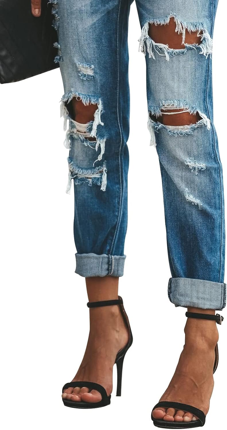 Women's High Waisted Casual Jeans Ripped Vintage Washed Denim with Cuffed Hem
