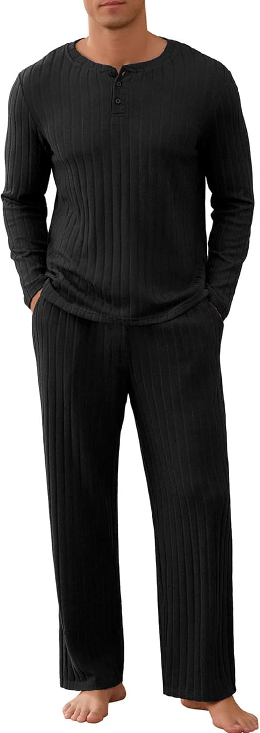 NITAGUT Men's Pajama Set Henley Collar Loungewear Long Sleeved Buttoned Sleepwear 2 Piece Pjs with Pockets