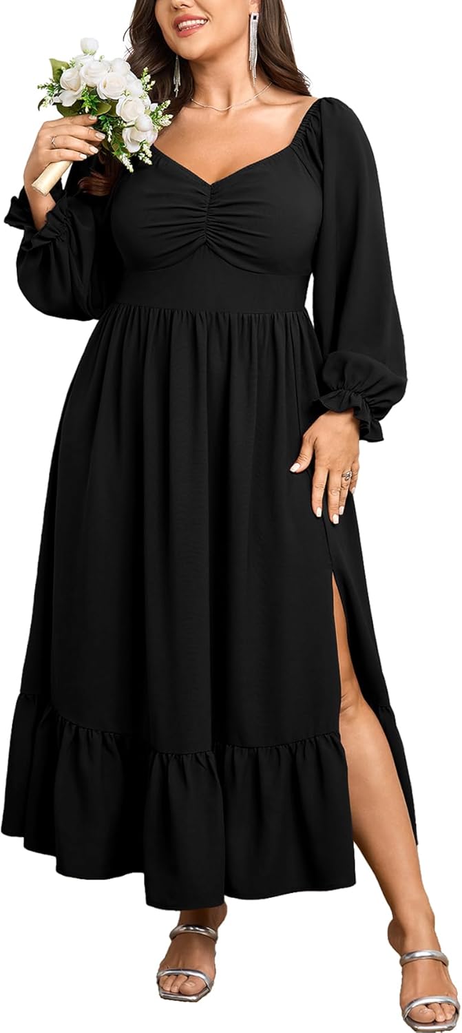 SCOMCHIC Womens Plus Size Wedding Guest Cocktail Dress Sweetheart Neckline Long Sleeve Smocked Ruffle Slit Maxi Dresses