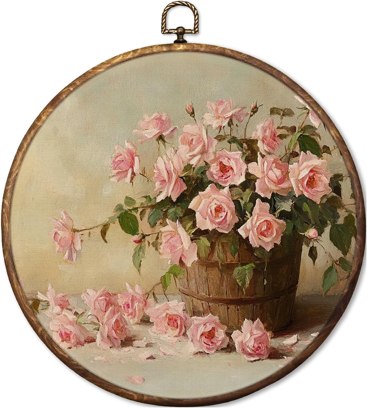 Fyecoluo Rustic Pink Rose Floral Round Canvas Wall Art, Cottagecore Botanical Floral Framed Canvas Art, Shabby Chic Flower Circle Wall Hanging Prints for Home Bedroom Living Room Decor, 10x10 Inches