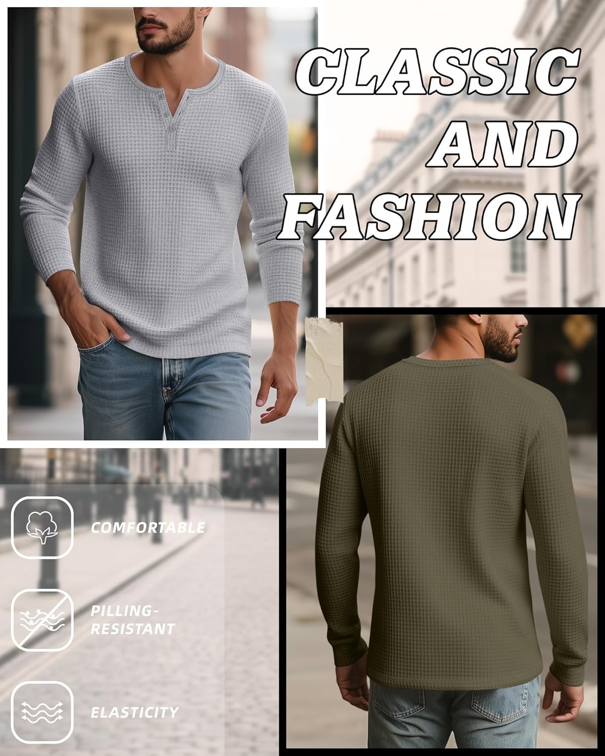 3 Pack Men’s Waffle Henley Shirts, Long Sleeve Button Tops Casual Basic T-Shirts Lightweight Knit Pullover
