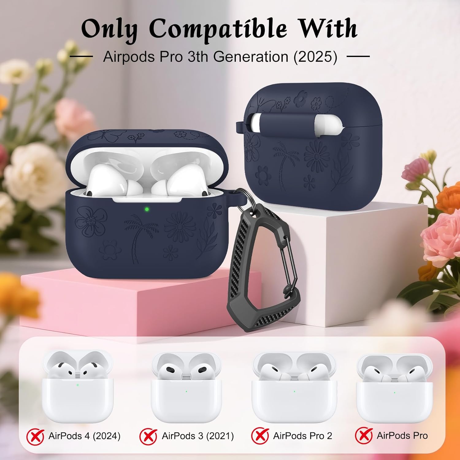 MATEPROX Flower Design Compatible with AirPods Pro 3 Case with Keychain/Hand Strap, Airpod Pro 3rd Generation[2025] Silicone Protective Headphone Cover Support Wireless Charging-Midnight Blue