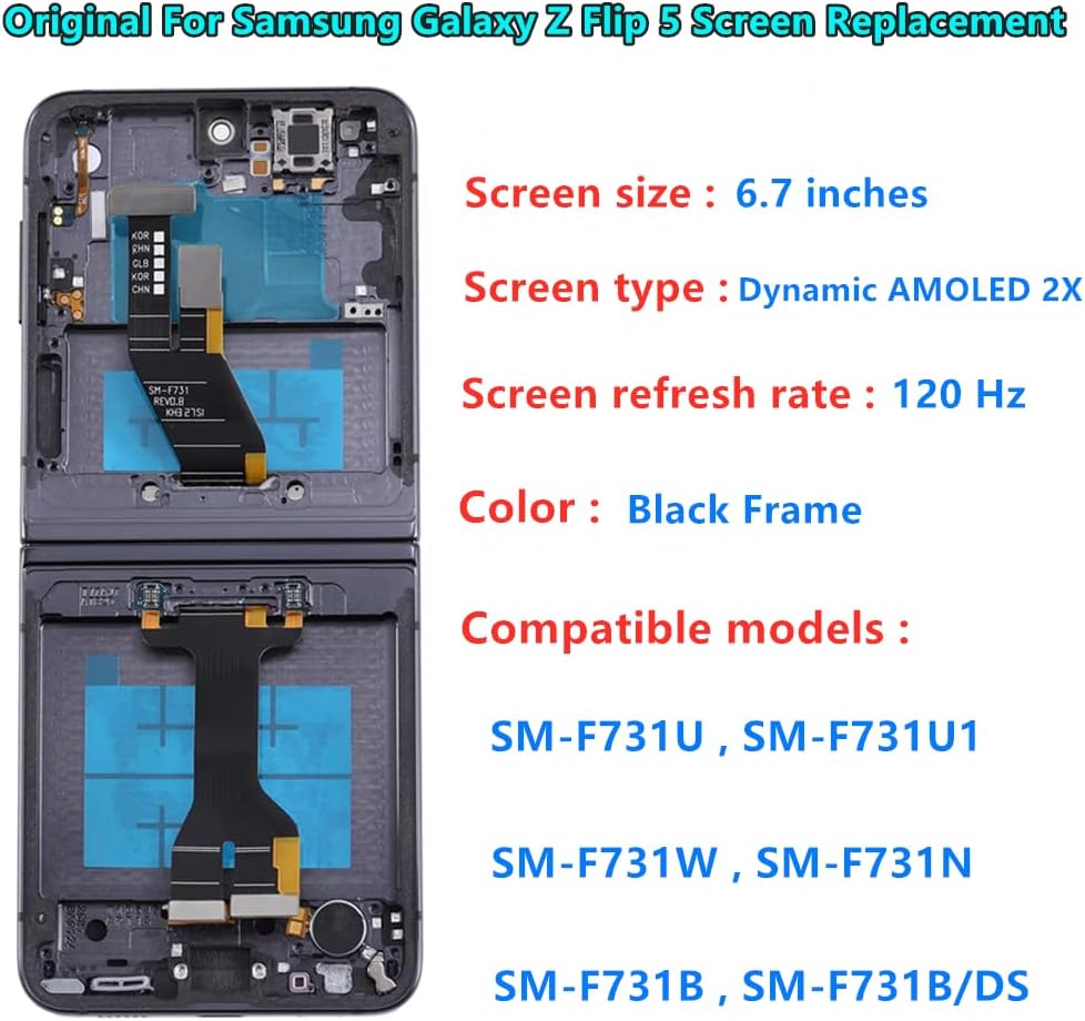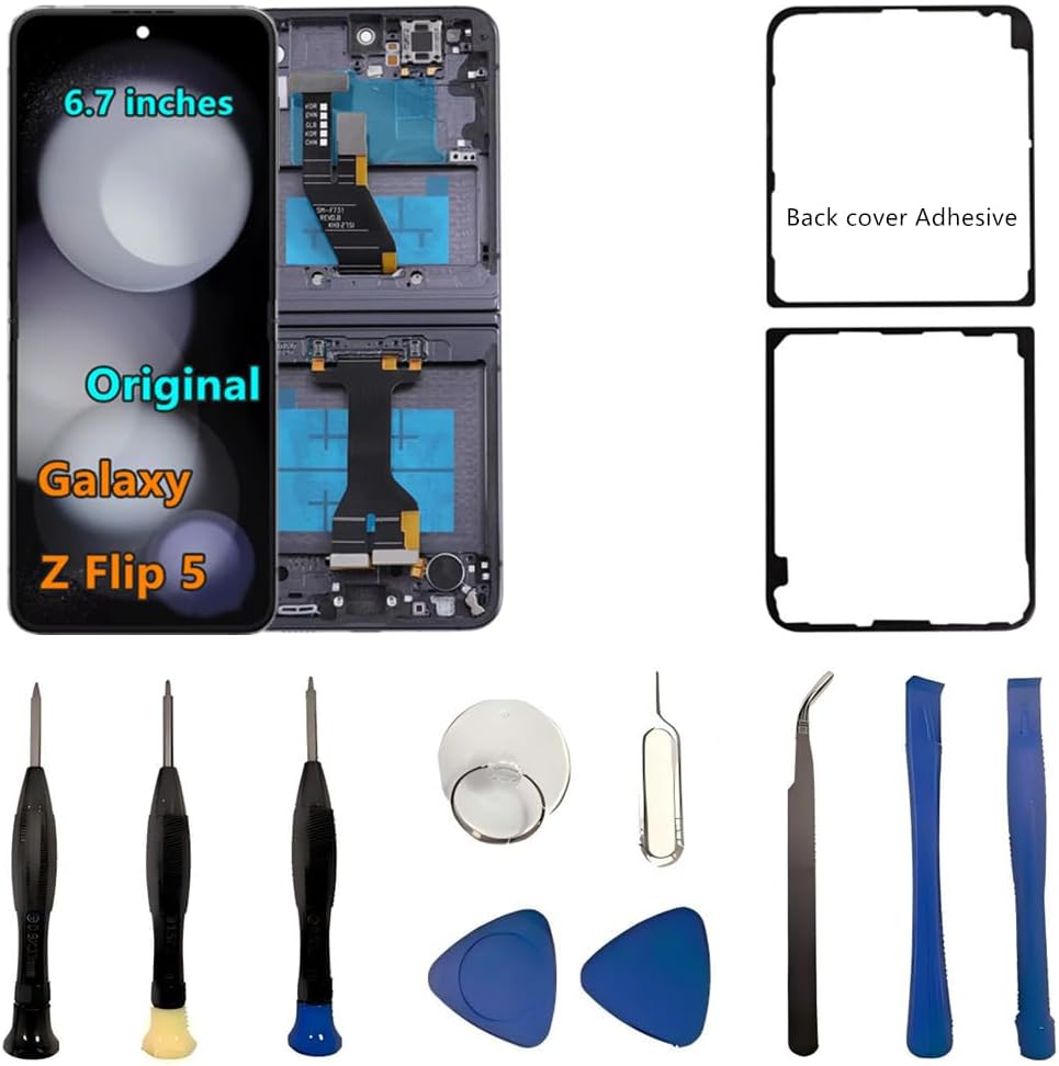 【Compatible models】: Please verify that your device is For Samsung Galaxy Z Flip 5 LCD display,compatible with SM-F731U,SM-F731U1,SM-F731N,SM-F731B,SM-F731B/DS,SM-F731W.If you purchase the wrong model by mistake,it will prolong the recovery time of your device and affect your life and mood. 【Quality Guarantee】All for Samsung Galaxy Z Flip 5 LCD replacement are strictly QC tested before shipment, 100% intact. Make sure for Galaxy Z Flip 5 replacement screen are no scratches, no dead zones, no dot pixels or lines on the screen. High color saturation, high resolution, wide color gamut and smooth hand feel. 【Purpose】:For Samsung Galaxy Z Flip 5 Screen With Frame material is high quality and affordable, perfectly fit your device,fix all kinds of screen problems such as white screen,dead pixels,liquid leakage,broken touch,etc. 【Screen installation】: Our screens come with repair tools, and if you have the skill to replace screens, You can watch installation videos on YouTube for repairs,but I still recommend that you go to a professional mobile phone repair shop to install the screen to avoid screen damage caused by improper operation. 【Packaging】: Origina Galaxy Z Flip 5 display + Back cover Adhesive + repair tools .