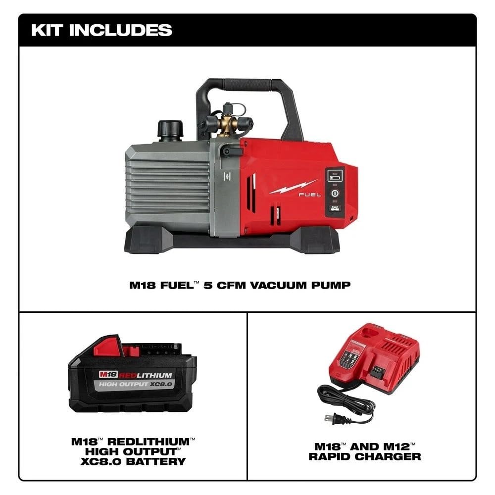 Includes: (1) M18 FUEL 5 CFM Vacuum Pump Kit(2941-21), (1) M18 XC8.0 Battery(48-11-1880), (1) M18 & M12 Rapid Charger(48-59-1808)