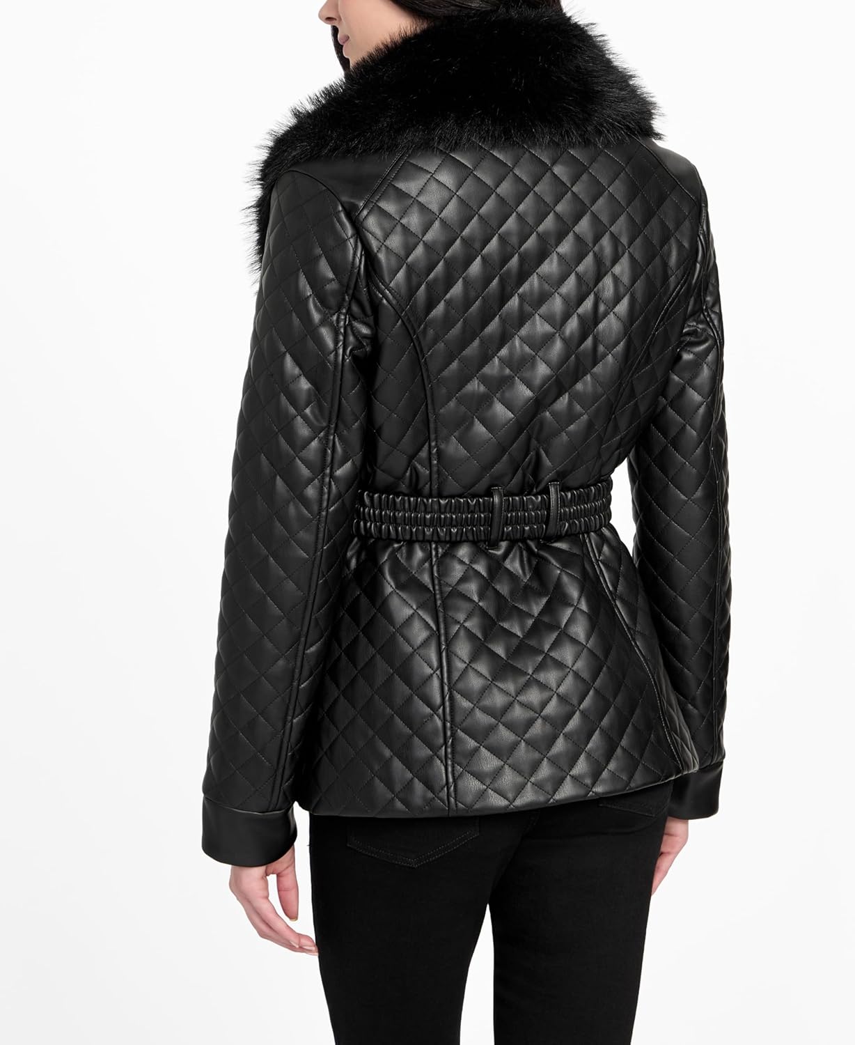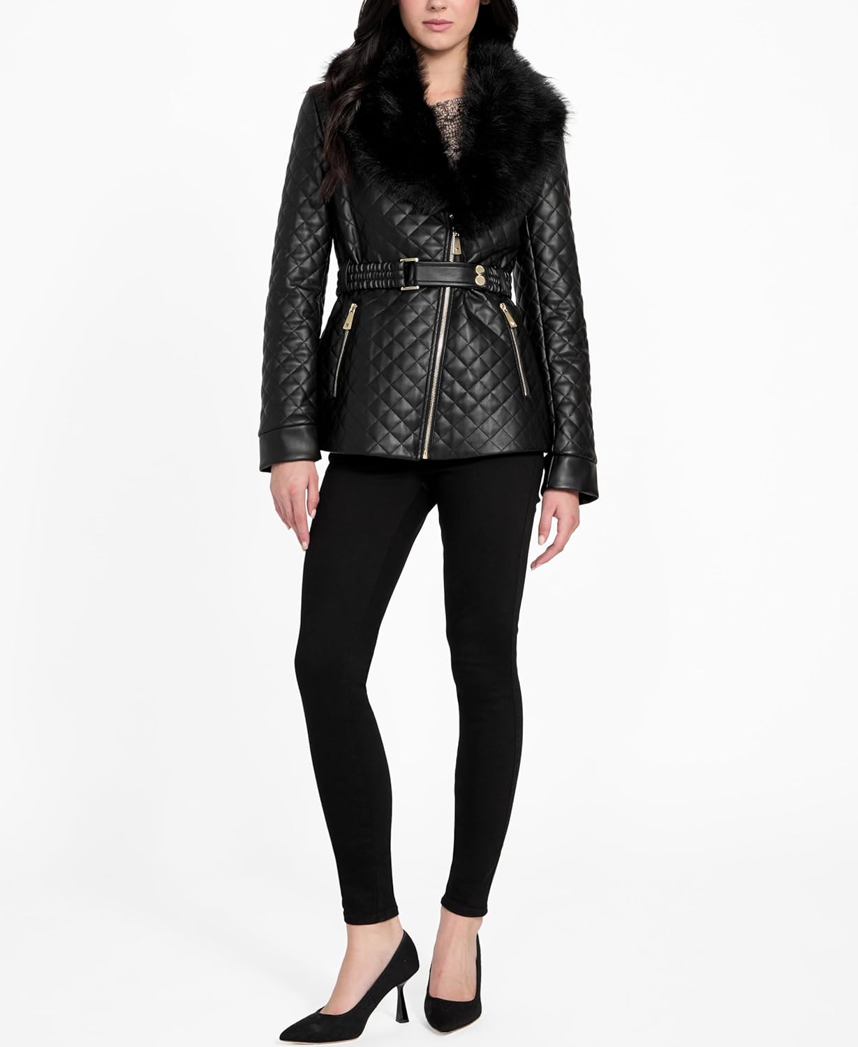 GUESS womens Oprah Fur Collar Diamond Faux Leather Jacket