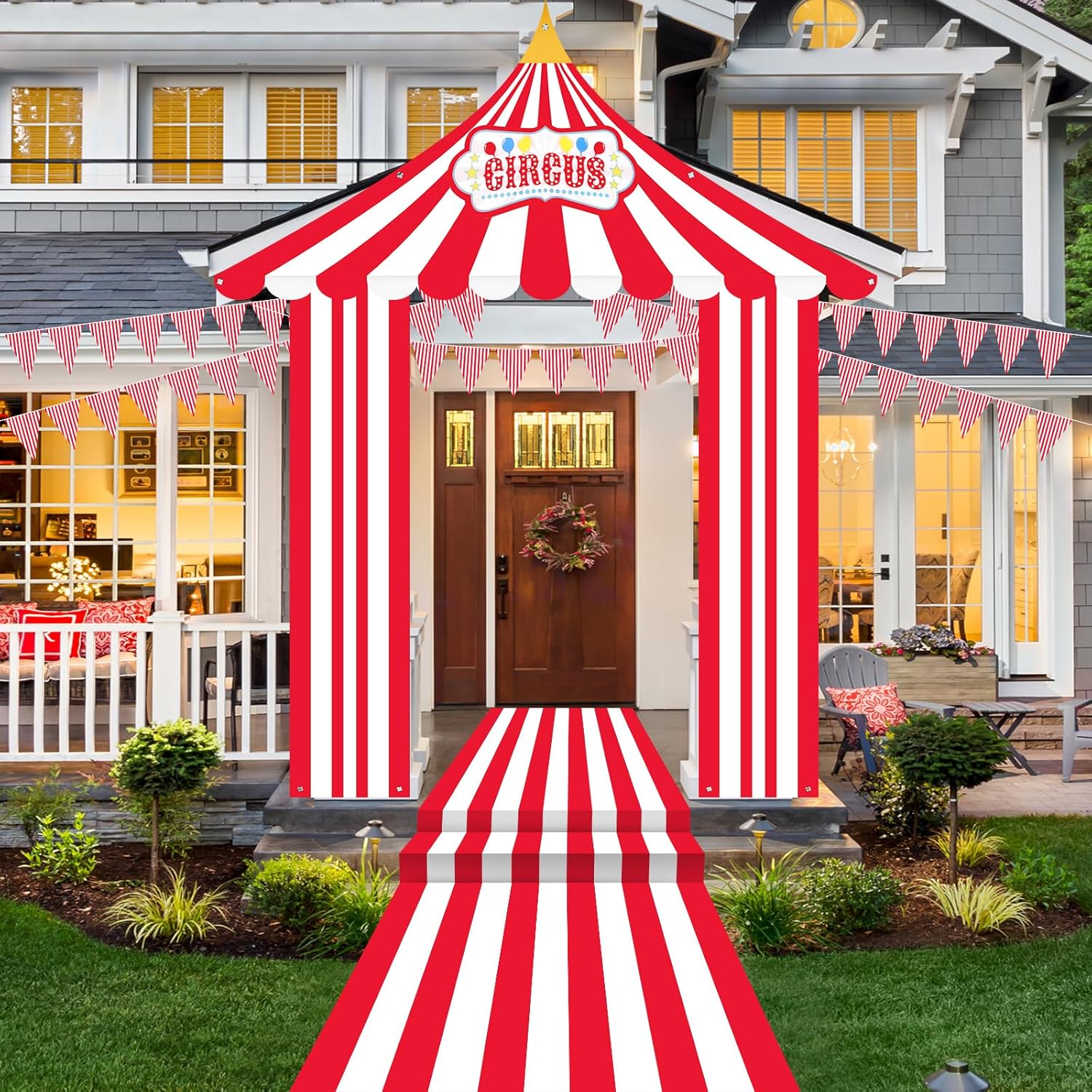 Large Size: Features a spacious circus tent canopy 70.8 x 26 inches, each triangle flag is 7.4 x 10.8 inches, and wide aisle runner 24 x 118 inches. These ample sizes ensure bold visibility, perfect for grand carnival party entrances, hallways, or halloween carnival decorations