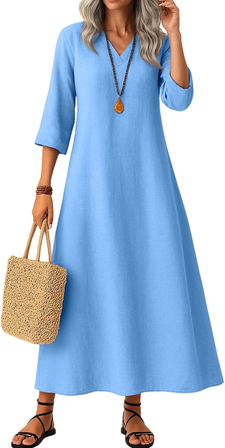 Cotton Linen Long Dresses for Women 3/4 Sleeve Solid Color Vacation Clothes 2025 V Neck Loose Fit A Line Cocktail Dress