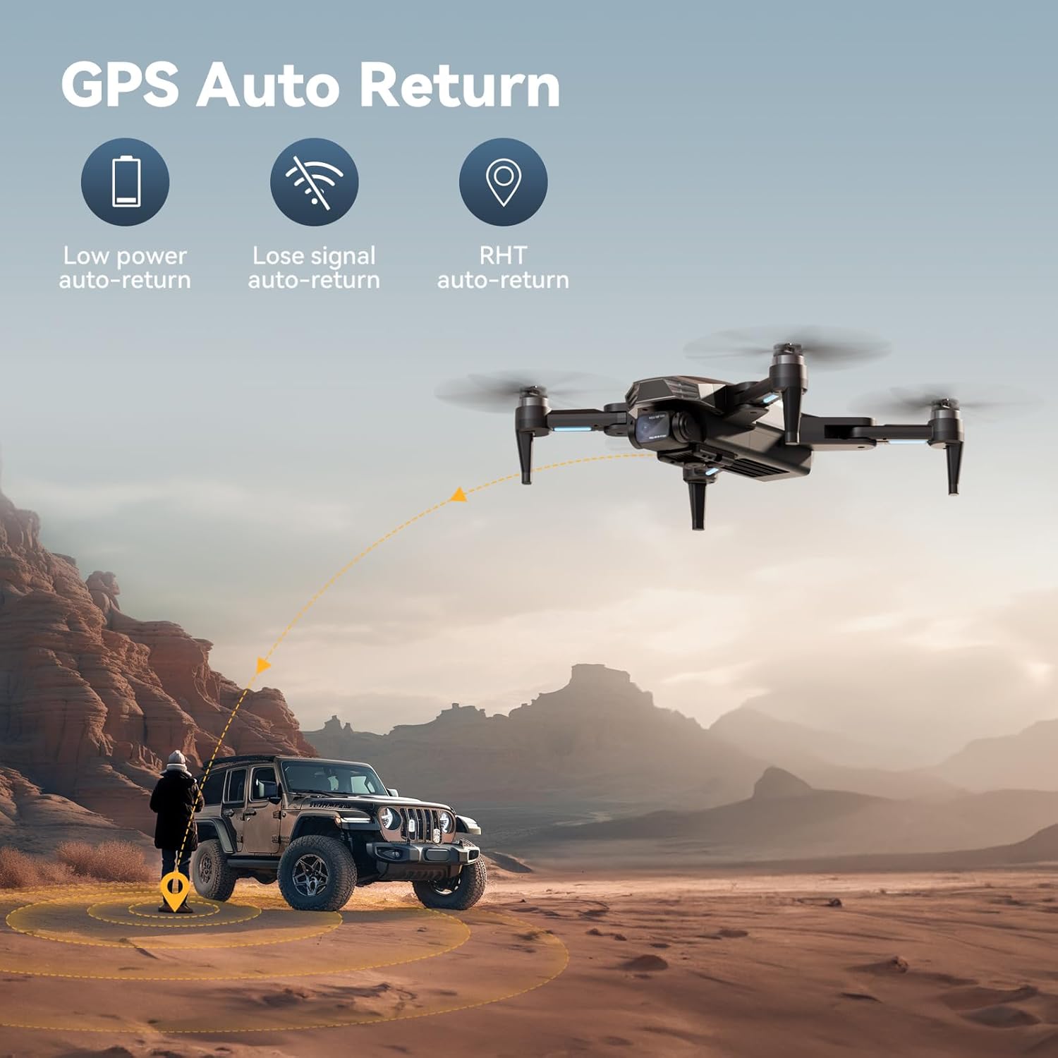 GPS Auto Return: Equipped with a GPS module, this drone can provides a high precision flying and RTH feature, which can bring your drone back to take-off point wherever you press the RTH button, or when the drone in low battery, signal-lost condition, you shall never lose your drone.