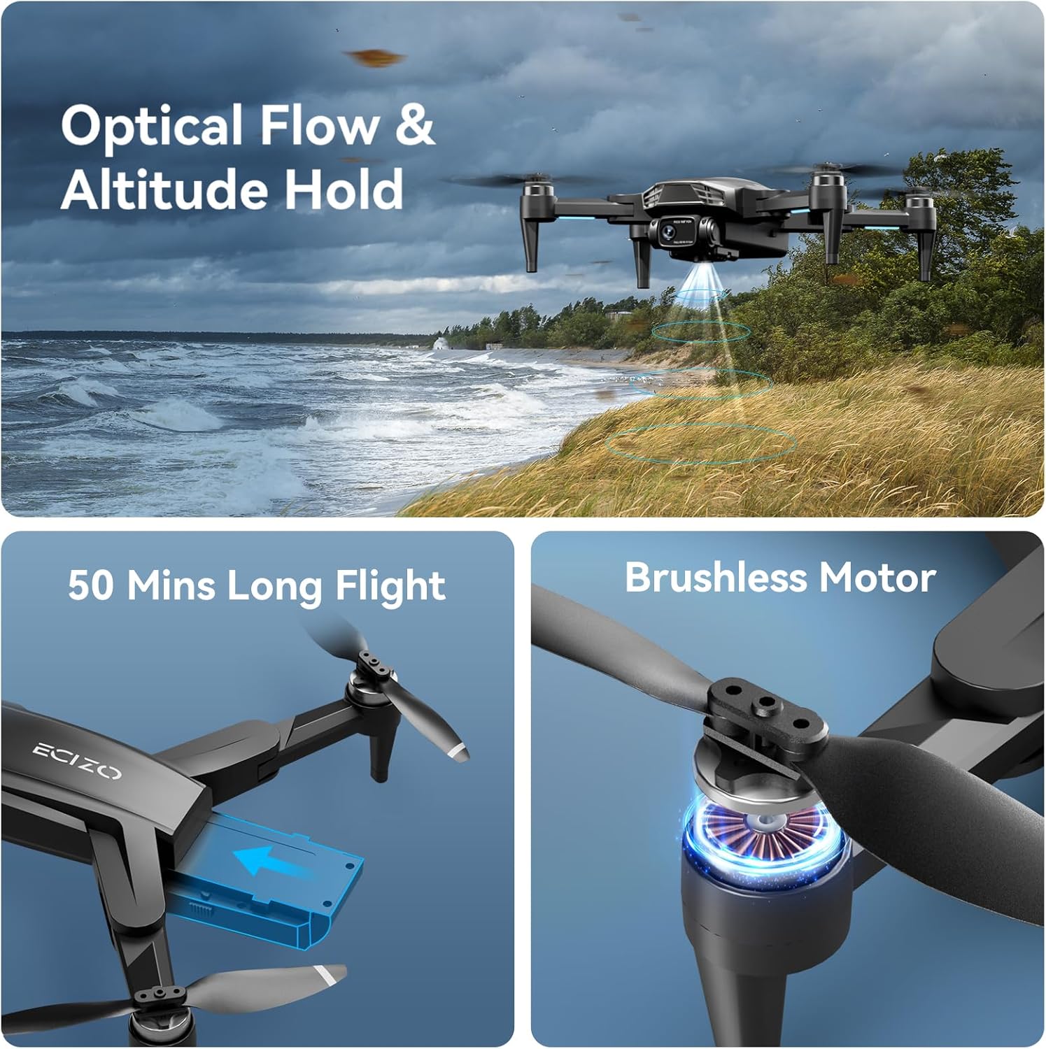 Smart and Easy to Control: This rc drone equipped with smart functions such as Optical Flow, Altitude Hold provide very precise and stable hovering; Headless Mode, One key Start, Speed Adjustment let the drone beginners control the it easily!
