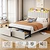 Full Size Bed Frames with Storage Headboard and 2 Drawers, Upholstered Platform Bed Frame Full with Led Lights and Handy Charging Station, No Box Spring Needed, Easy Assembly, Noise Free, Beige