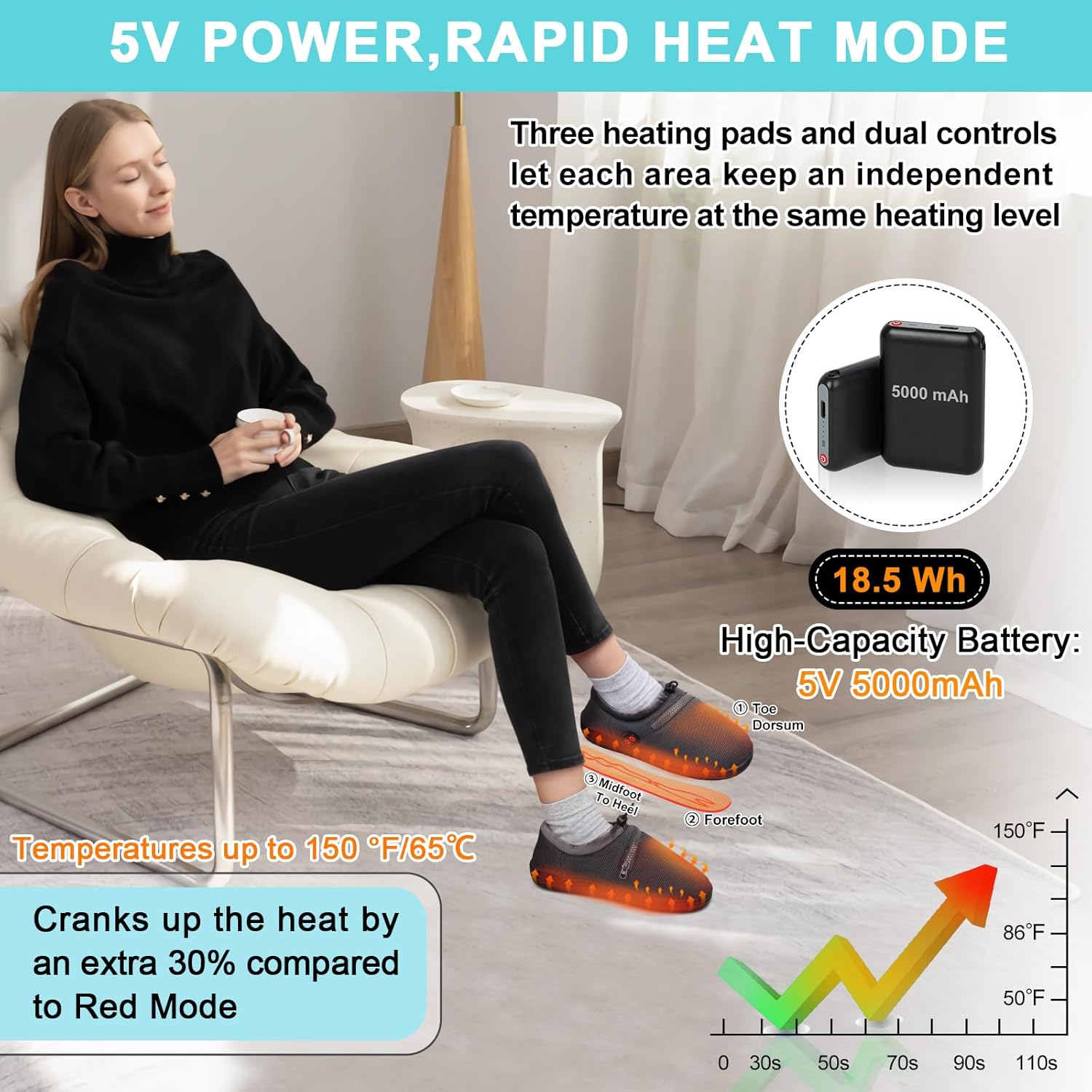 【 100% Output Mode 】These heated slippers feature a higher power output compared to the previous model and a rapid heating mode, delivering 100% heat output, 20% higher than the red mode. The carbon fiber heating element covers the instep and sole, precisely warming the most vulnerable areas for 360-degree comfort.