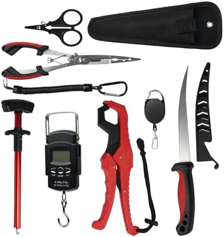 RAWILL Fishing Kit,Filleting Knife,Hook Remover,Fish Grip, Line Cutter,Fishing Scale, Pliers with Lanyards,Not Include Batteries