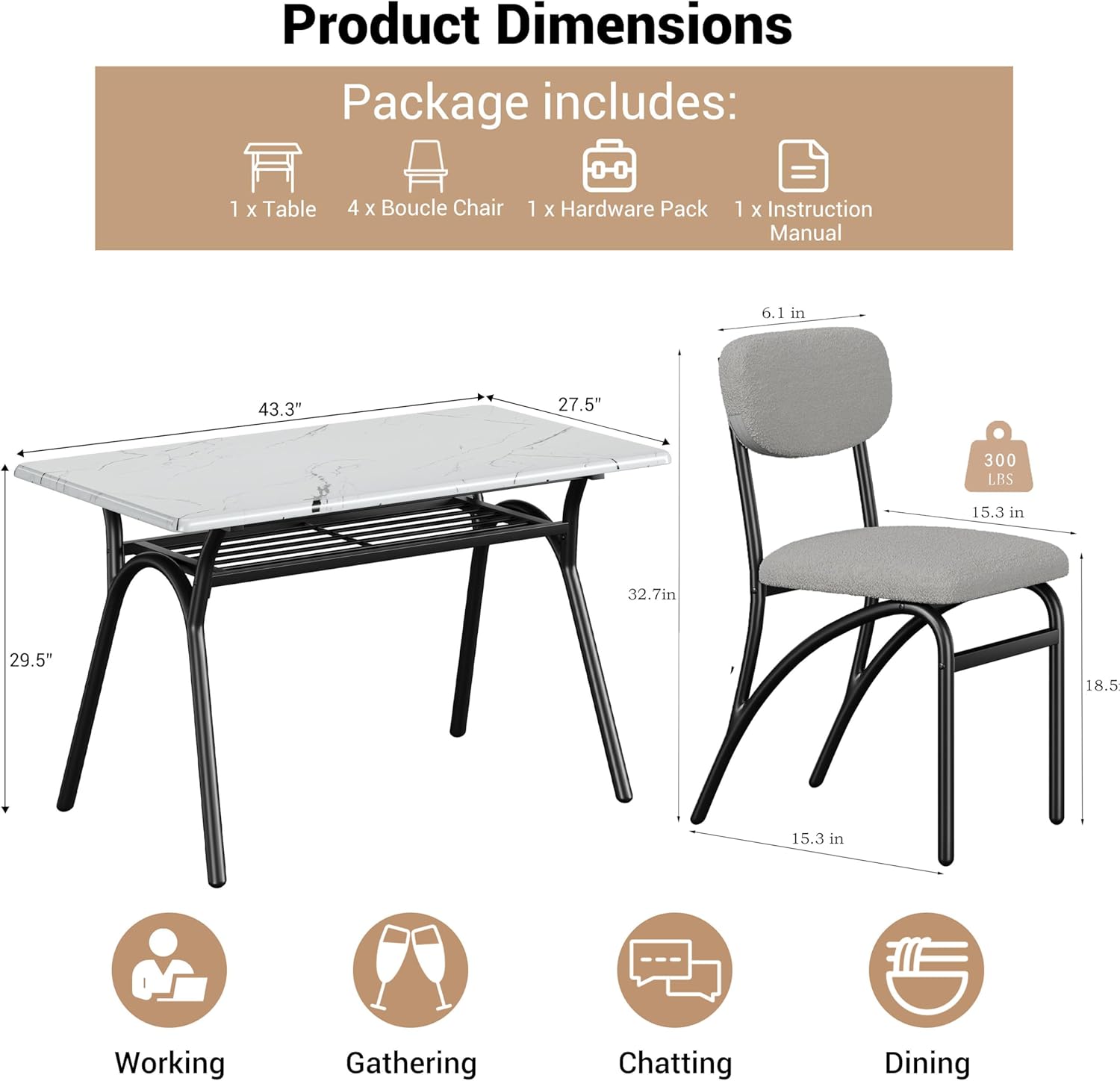 GarveeHome 5-Piece Dining Table Set for 4, Modern Kitchen Table with 4 Boucle Chairs, Rectangular Dining Table with Storage Shelf & Marble Tabletop, Beige Home Dining Furniture for Small Space