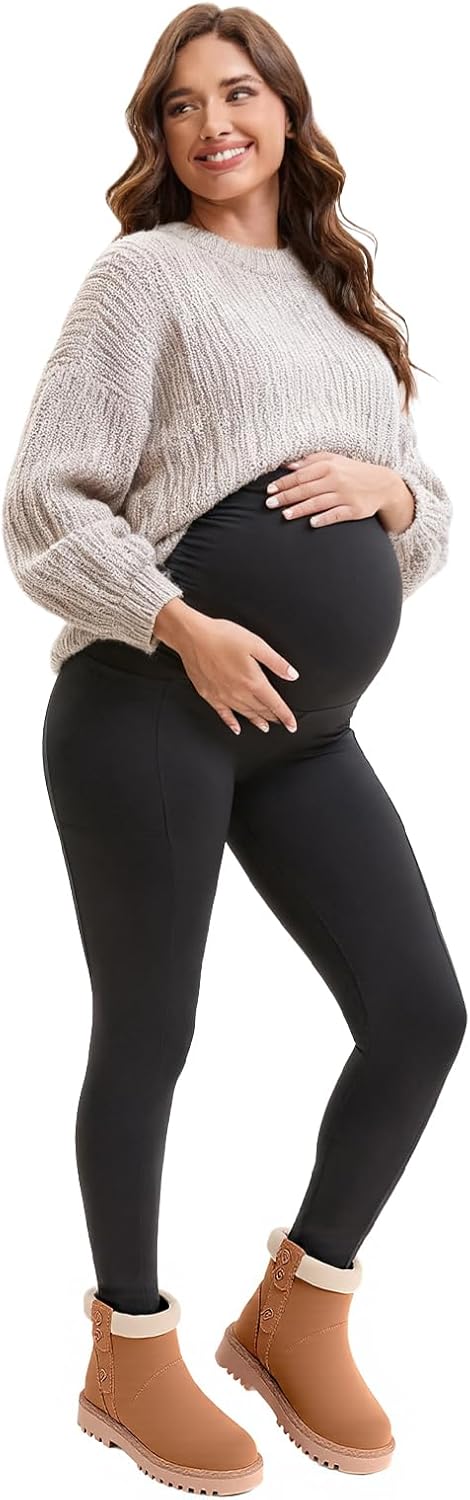 Womens Maternity Fleece Lined Leggings with Pockets, Winter Thermal Pregnancy Workout Yoga Pants
