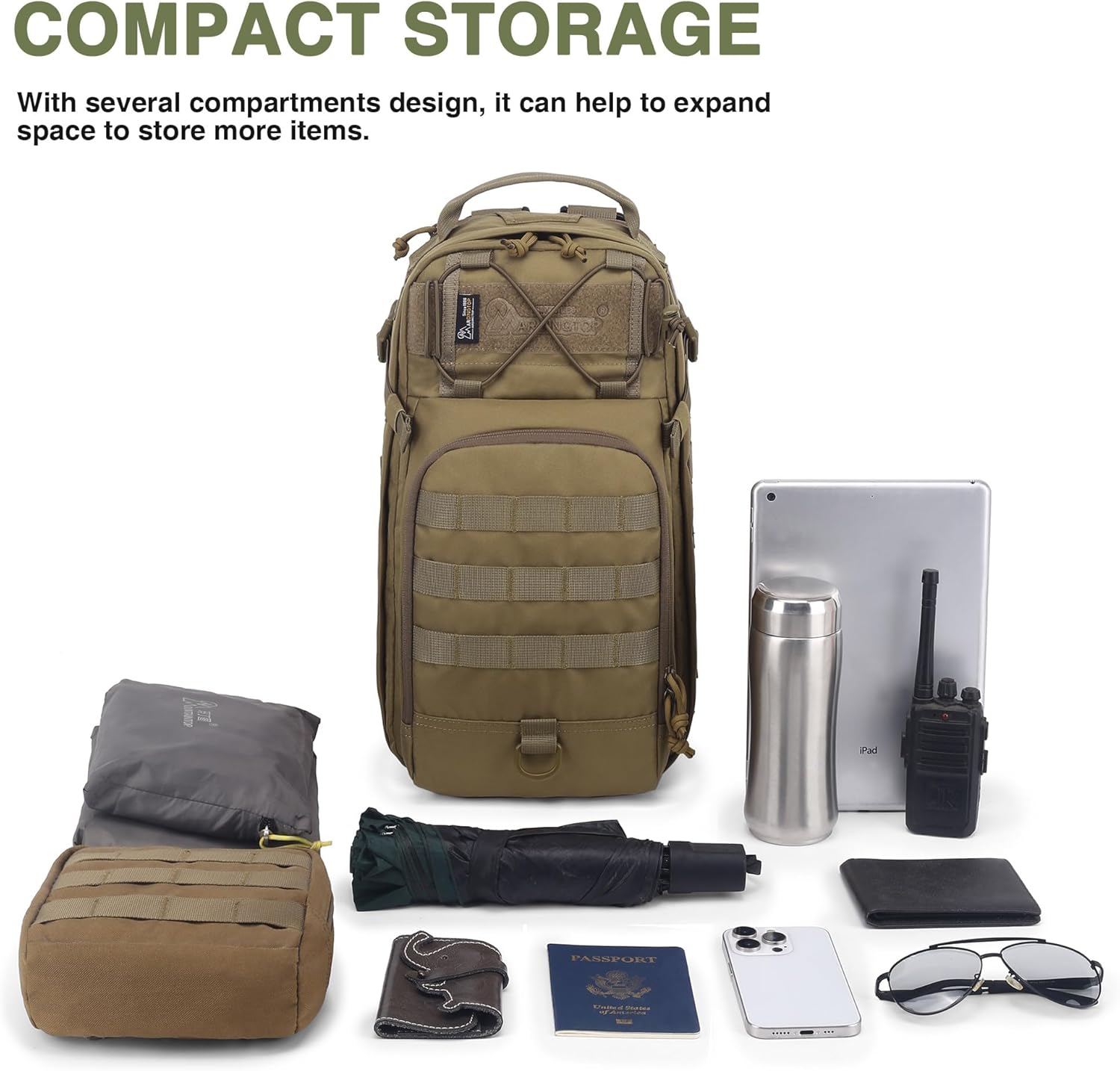 Tactical Molle Backpack: Molle webbing throughout this small tactical backpack for attaching additional tactical pouches or hiking gear, The patch area on the top of this hiking backpack can be used.