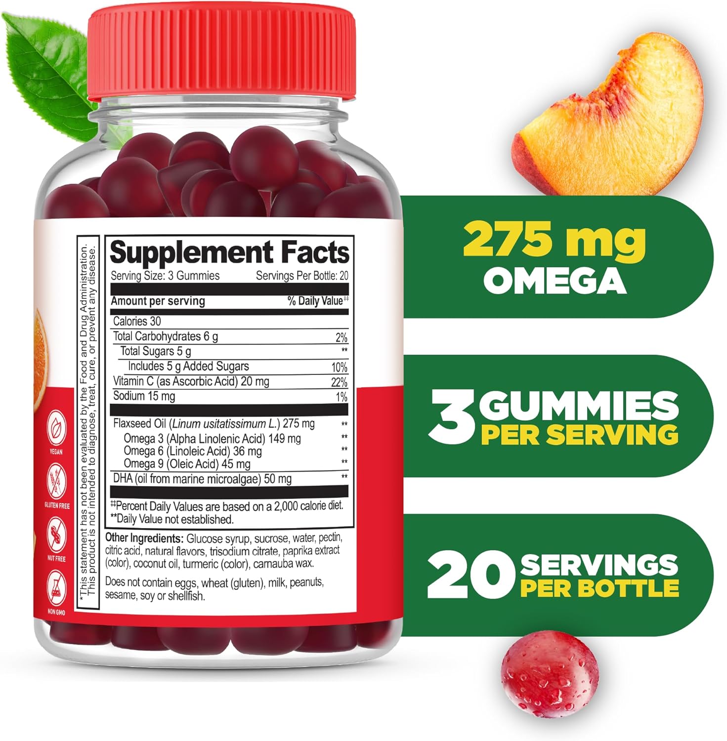 275mg Flaxseed Oil & 50mg DHA Per Serving: Each bottle contains 60 omega 3 gummies with 2 gummies per serving for a 20-day supply. Optimal daily omega 3-6-9 supplement dosage provides essential fatty acids for adults, women and men.