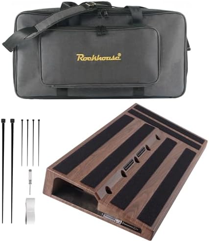 Transform your guitar setup with this professional-grade Rockhouse pedalboard system. The spacious 22 x 11 inch wooden-textured board provides ample room for organizing your effect pedals, while the built-in power supply storage compartment keeps your setup clean and organized. Perfect for folk, rock, and blues musicians, this pedalboard comes complete with all necessary mounting accessories to secure your pedals firmly in place. The included heavy-duty carry bag features the Rockhouse logo and makes transportation safe and convenient. The ABS construction ensures durability while maintaining a classic aesthetic with its wood-grain finish. The thoughtfully designed layout accommodates various pedal configurations, making it ideal for both studio sessions and live performances. The board includes mounting brackets, cable ties, and all required hardware for a complete setup straight out of the box. Whether you're a touring musician or studio artist, this pedalboard system offers the perfect balance of functionality, durability, and style.