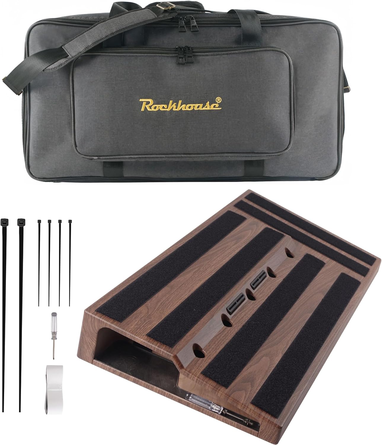 Rockhouse Guitar Pedal Board Case with Carry Bag, ABS Pedalboard 22'' x 11'', Built-in Power Supply Storage, Includes Mounting Accessories for Folk, Rock, Blues Musicians, Wood Texture