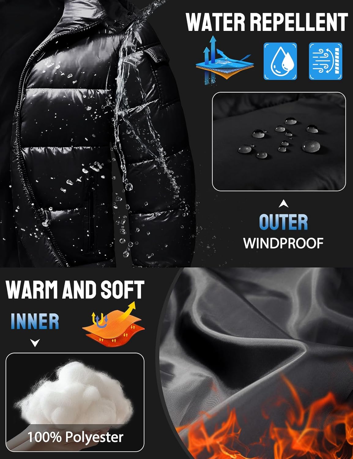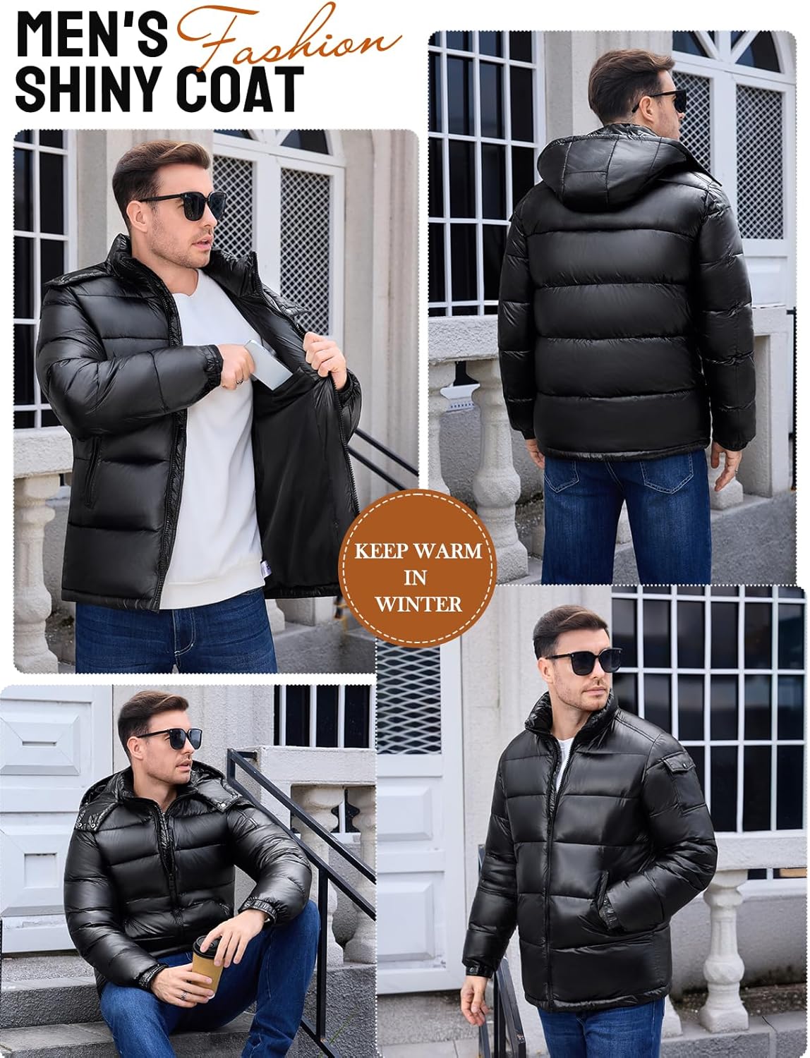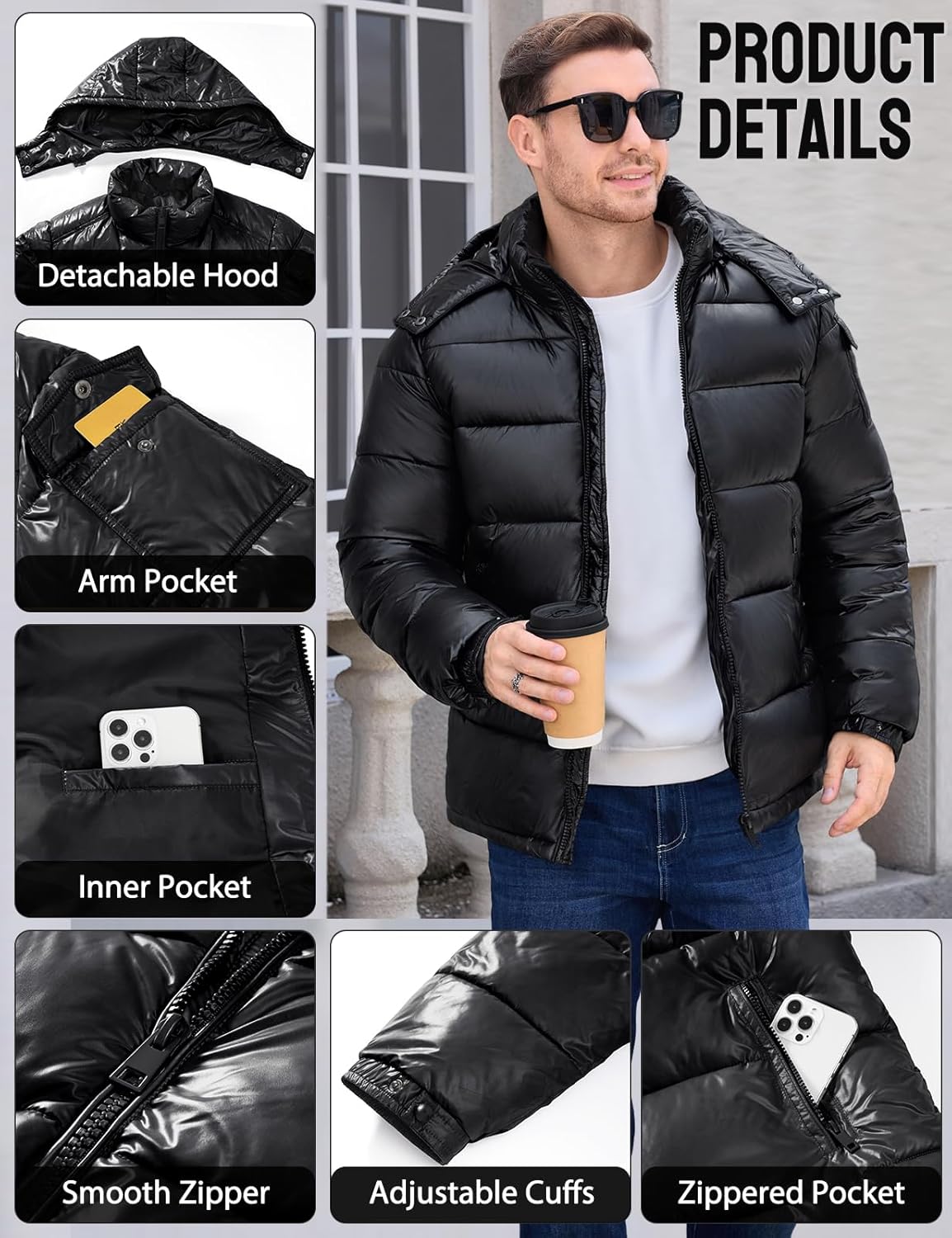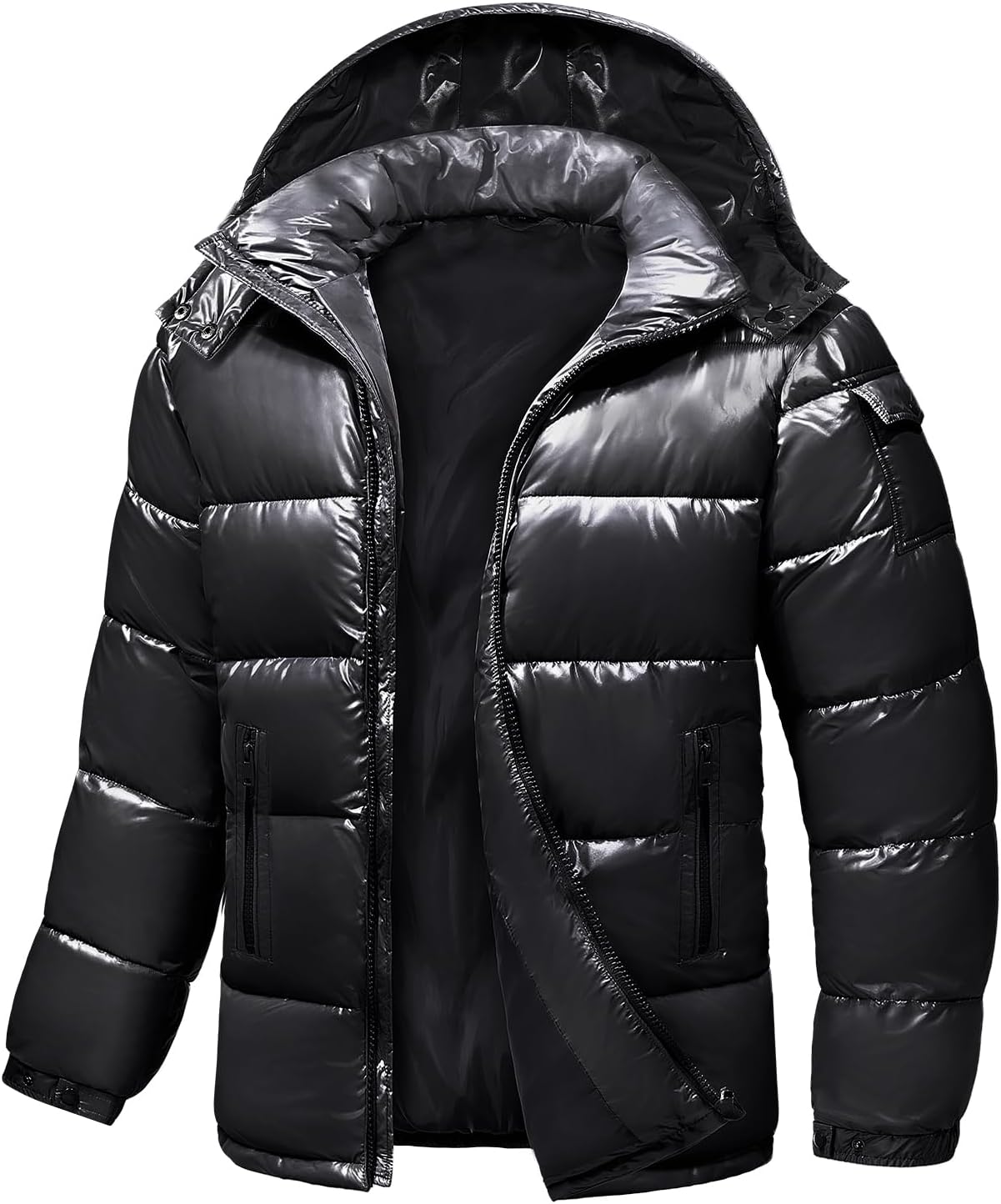 Yusongirl Men Shiny Puffer Jacket Black Waterproof Outerwear Zip Up Winter Coat Warm Detachable Hoody Travel Puffy Clothes