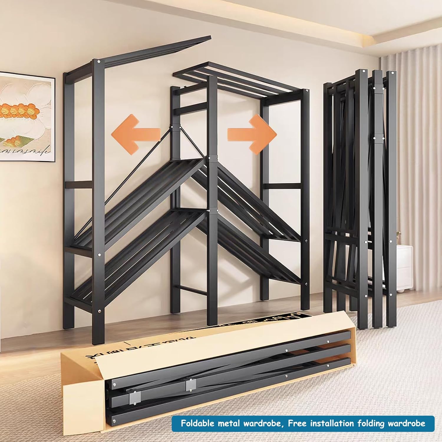 【Black Metal Frame,High Bearing Capacity】This black metal wardrobe closet is made of 0.7mm wall thickness, upgraded 1.18*0.59inch Rectangular square tube, ensure that the tall wardrobe closet is sturdy and durable, meet your long-term storage needs. Foldable portable wardrobe closet for hanging clothing back is designed with an "x"-shaped pull rod and add 3 beams on the upper part to improve stability.