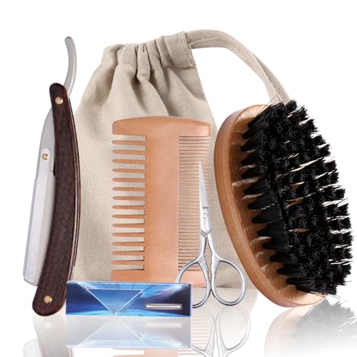 Beard Brush and Comb Set for Men - Straight Edge Razor and Shaving Scissors, Natural Boar Bristle, Dual Action Wood Comb, Travel Pouch - Great for Grooming Beards and Mustaches