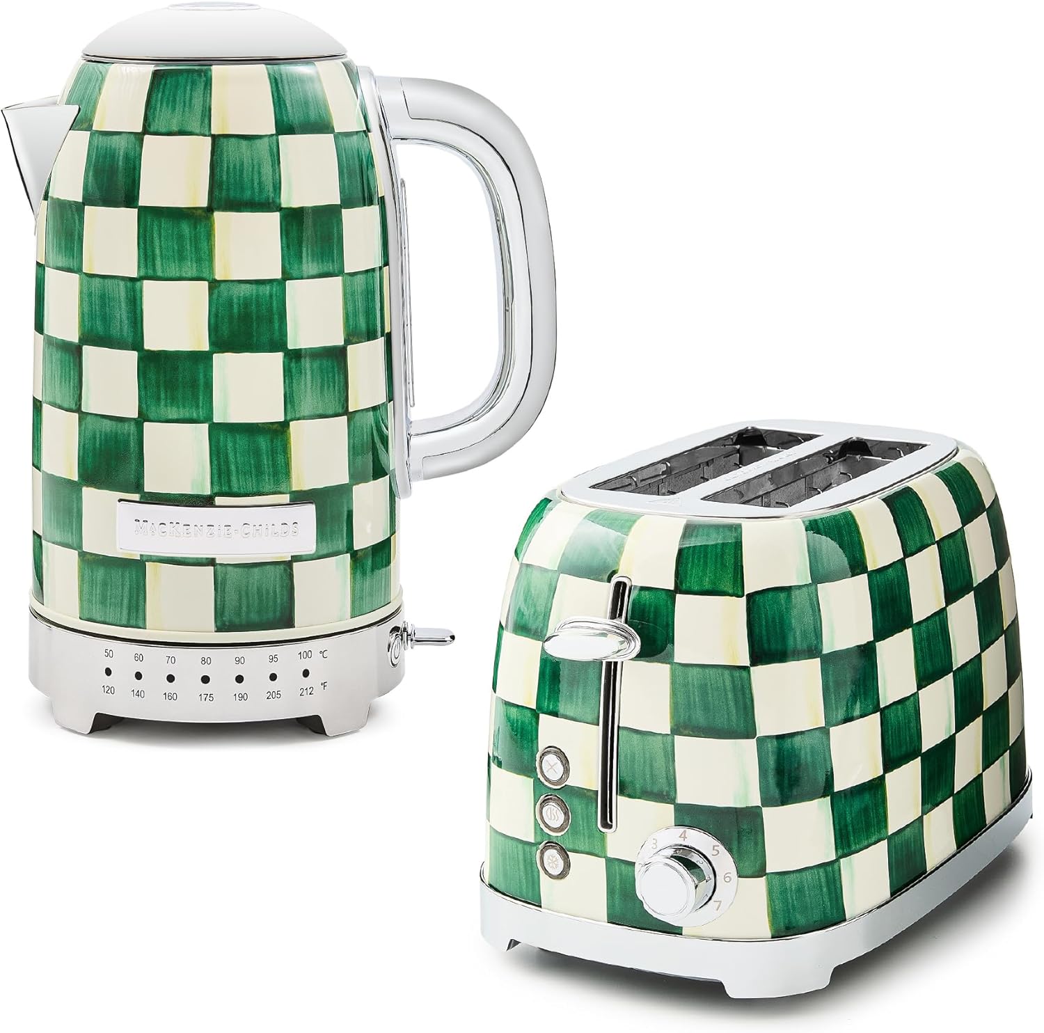 MACKENZIE-CHILDS Stainless-Steel Electric Kettle Bundle with Stainless-Steel 2-Slice Toaster, Green-and-White Emerald Check