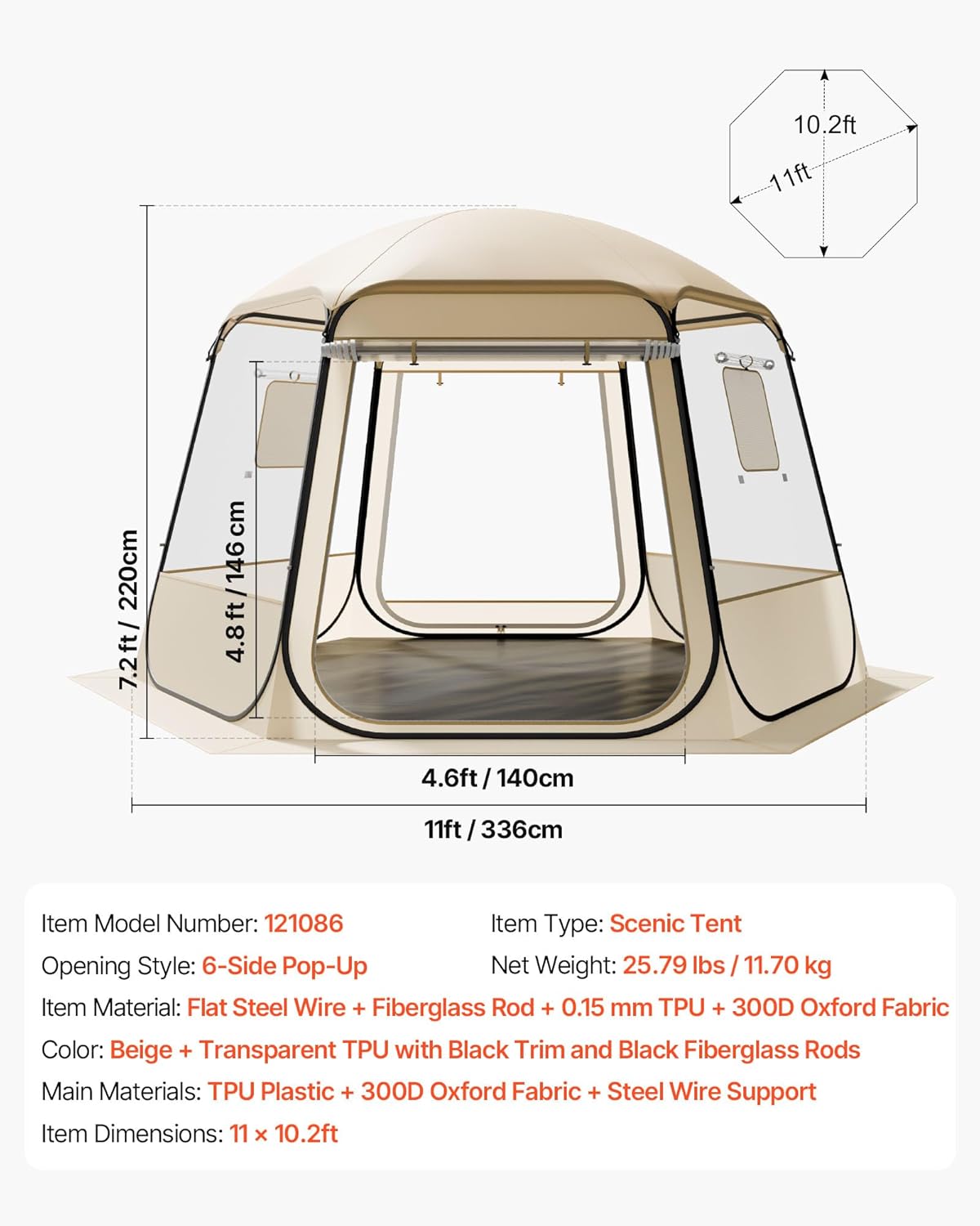 Clear Pop-Up Bubble Tent: Easily sets up this pop up bubble tent in seconds with a quick pop-up design, best for cool autumn/winter use (not for hot weather). Spacious 11×10.2×7.2 ft interior fits 8–10, yet the 25.79 lb build stays easy to carry between patio, lawn, and park. Enjoy a 540° panoramic view and fully immerse yourself in the natural surroundings. Note: Not recommended for use in heavy rain, strong winds, or snowstorms.