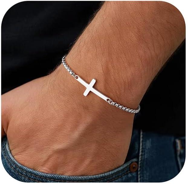 M MOOHAM Stainless Steel Cross Bracelet for Men, Silver/14K-Gold-Plated Cross Chain Bracelet Sturdy Cuban Link Figaro Box Chain Bracelets Christian Jewelry Religious Baptism Gifts for Men