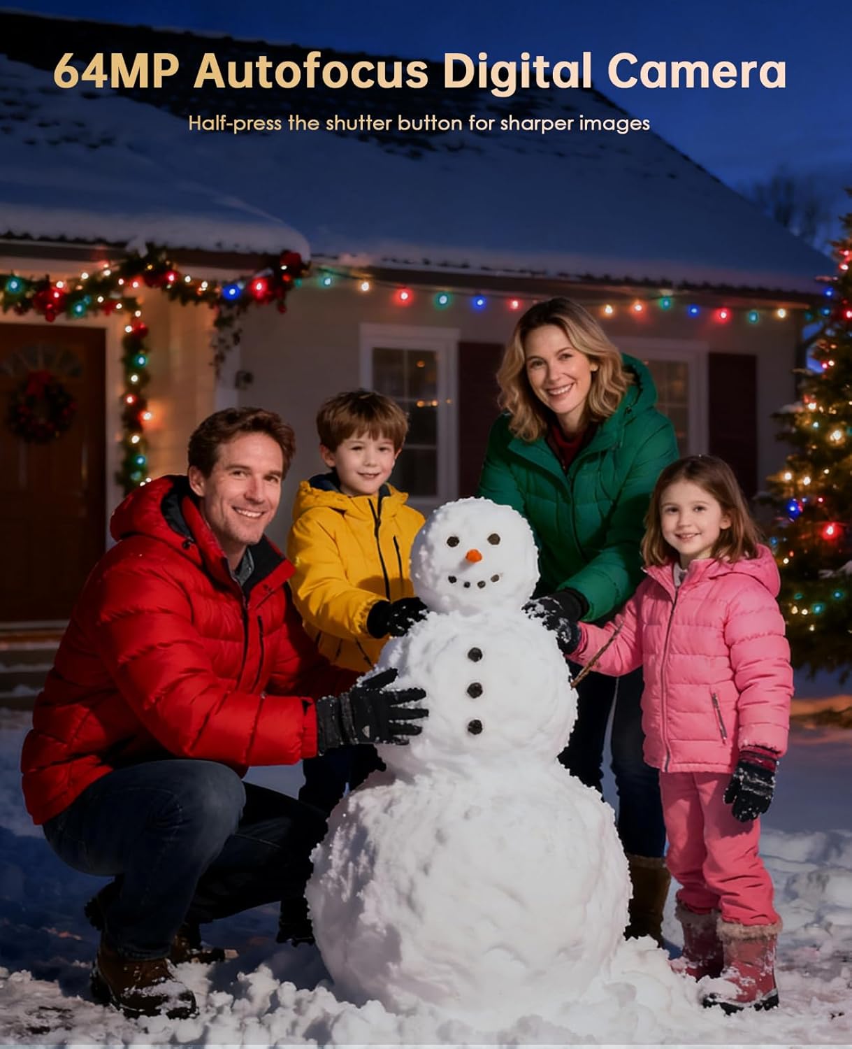 【Multifunctional 4K Camera: Perfect Gifts for Family】---- Our vlogging camera supports time-lapse, slow-motion, continuous shooting, self-timer, timestamp control, and filters. Additionally, it can serve as a webcam, making it ideal for live streaming.With this photography camera, you will receive: A 64MP high-resolution digital camera, 2 batteries, A charging stand, An adapter, A 32GB SD card, A manual, A cleaning cloth, A camera bag, A lanyard. If you have any problem with this compact camera, please feel free to contact us, and we will respond within 24 hours