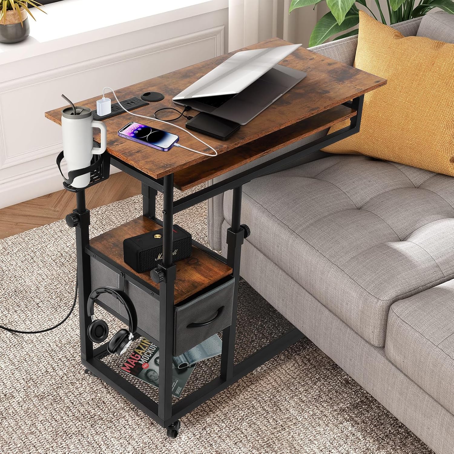 FAHKNS Adjustable C Table with Charging Station, Tiltable Desk C Shaped End Table for Couch, Over Bed Table with Wheels Adjustable Height, Hospital Laptop Stand Drawing Desk