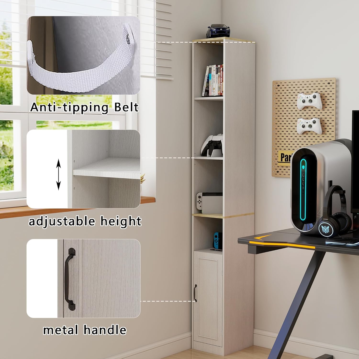 ADJUSTABLE DESIGN: The tall slim bookshelf features 2 adjustable shelves of and height options for customizable storage space, with a secure anti-tipping belt for safety,Convenient open shelf design with bottom cabinet door, allowing quick access to stored items while keeping some items concealed