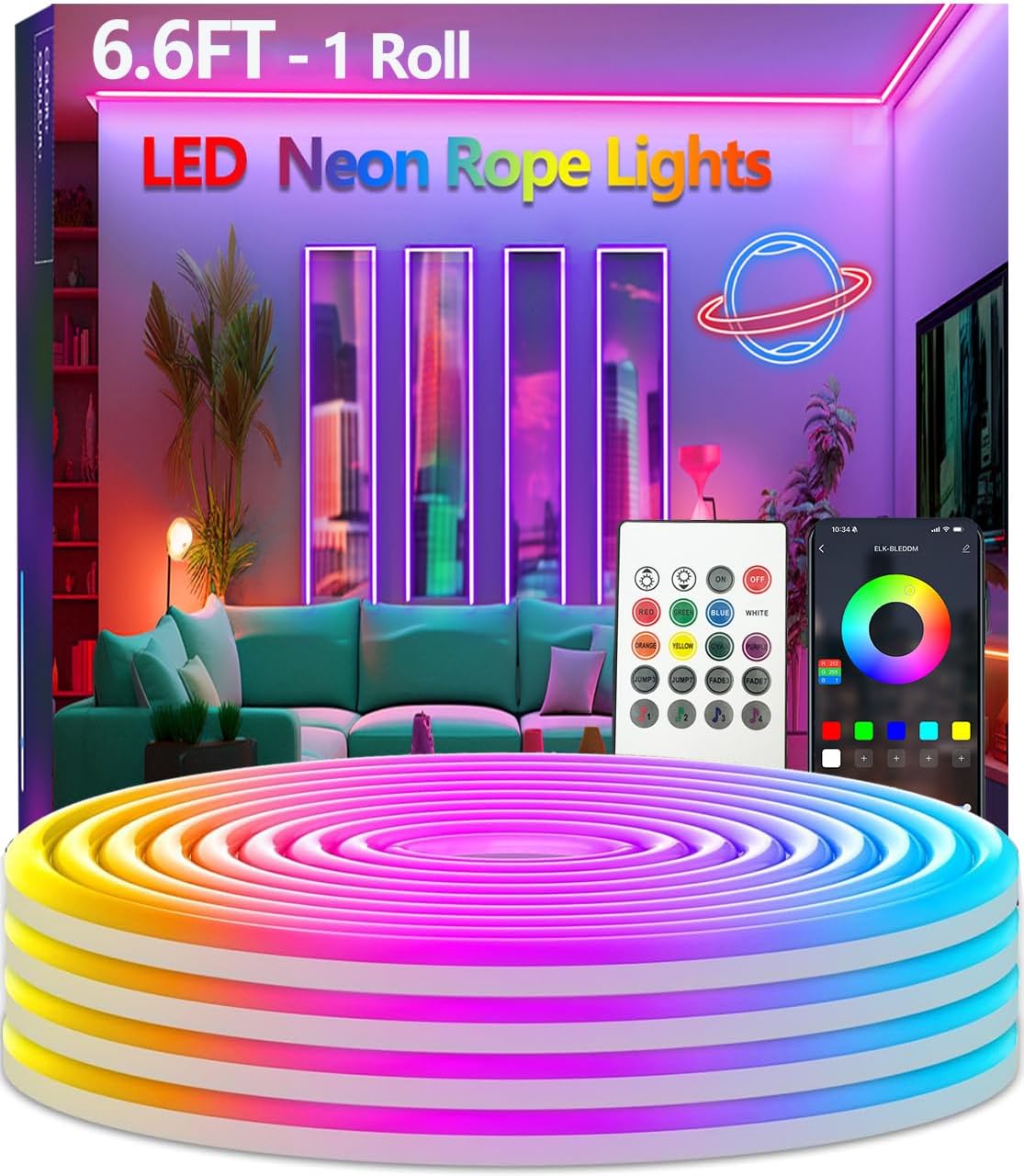 6.6Ft RGB Rope Lights,Flexible Led Lights Control with App/Remote,Multiple Modes Neon Strip Lights,IP65 Outdoor Waterproof,Music Sync Light Strip for Bedroom