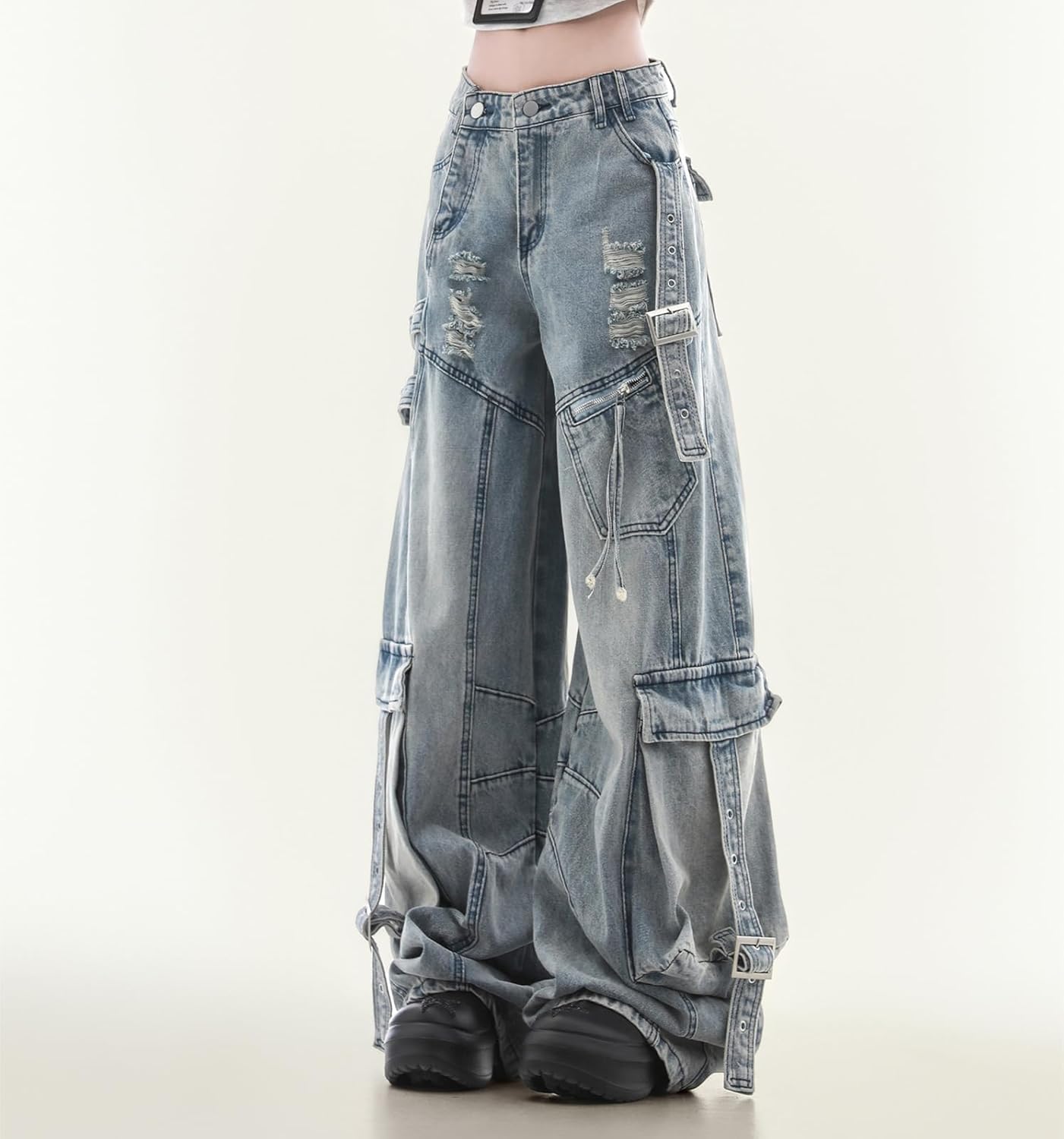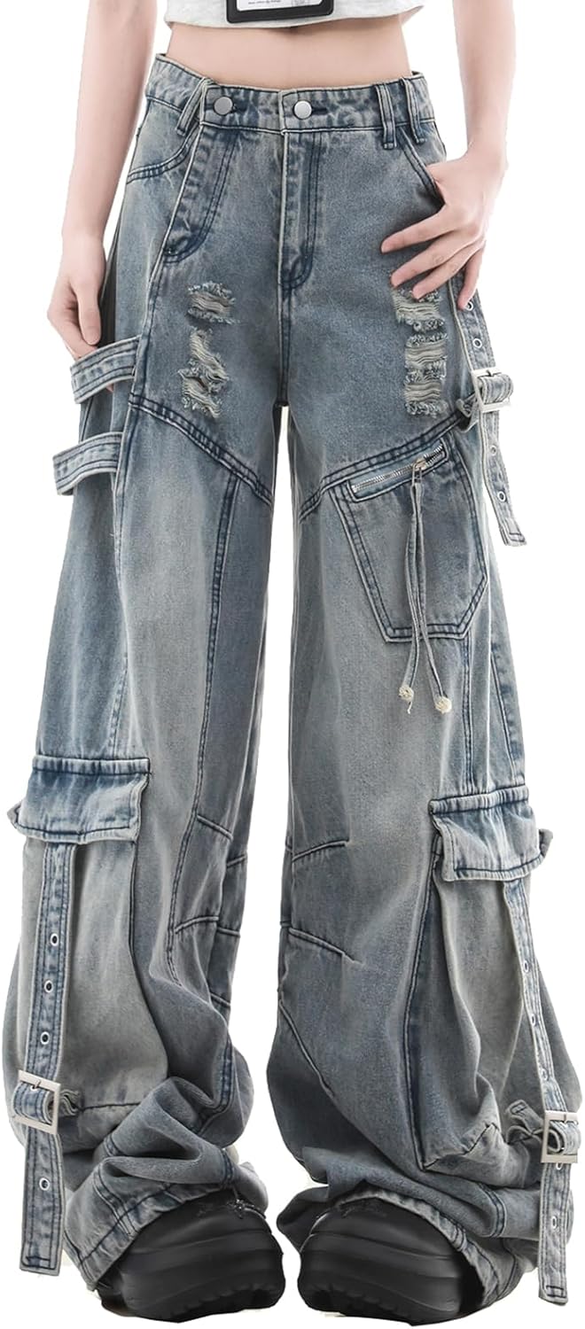 Women's Y2K Loose Cargo Jeans: Step into the Y2K revival with these vintage blue jeans featuring multiple utility pockets and ripped details, perfect for hip-hop Harajuku street style this fall season. Oversized Wide-Leg Comfort: Designed with a spacious wide-leg cut and functional cargo pockets that combine urban edge with ultimate comfort, ideal for autumn layering. Multi-Pocket & Ripped Design: Multiple utility pockets combined with strategic rips create a rugged yet fashionable look with authentic Y2K workwear authenticity. Low-Rise Vintage Distressed Finish: The relaxed waistline with artful distressing delivers true Y2K proportions with modern comfort, perfect for creating seasonal street style looks. Versatile Autumn Street Essential: Perfect for creating hip-hop inspired outfits or Japanese retro looks, these cargo jeans transition effortlessly from day to night in cooler weather.