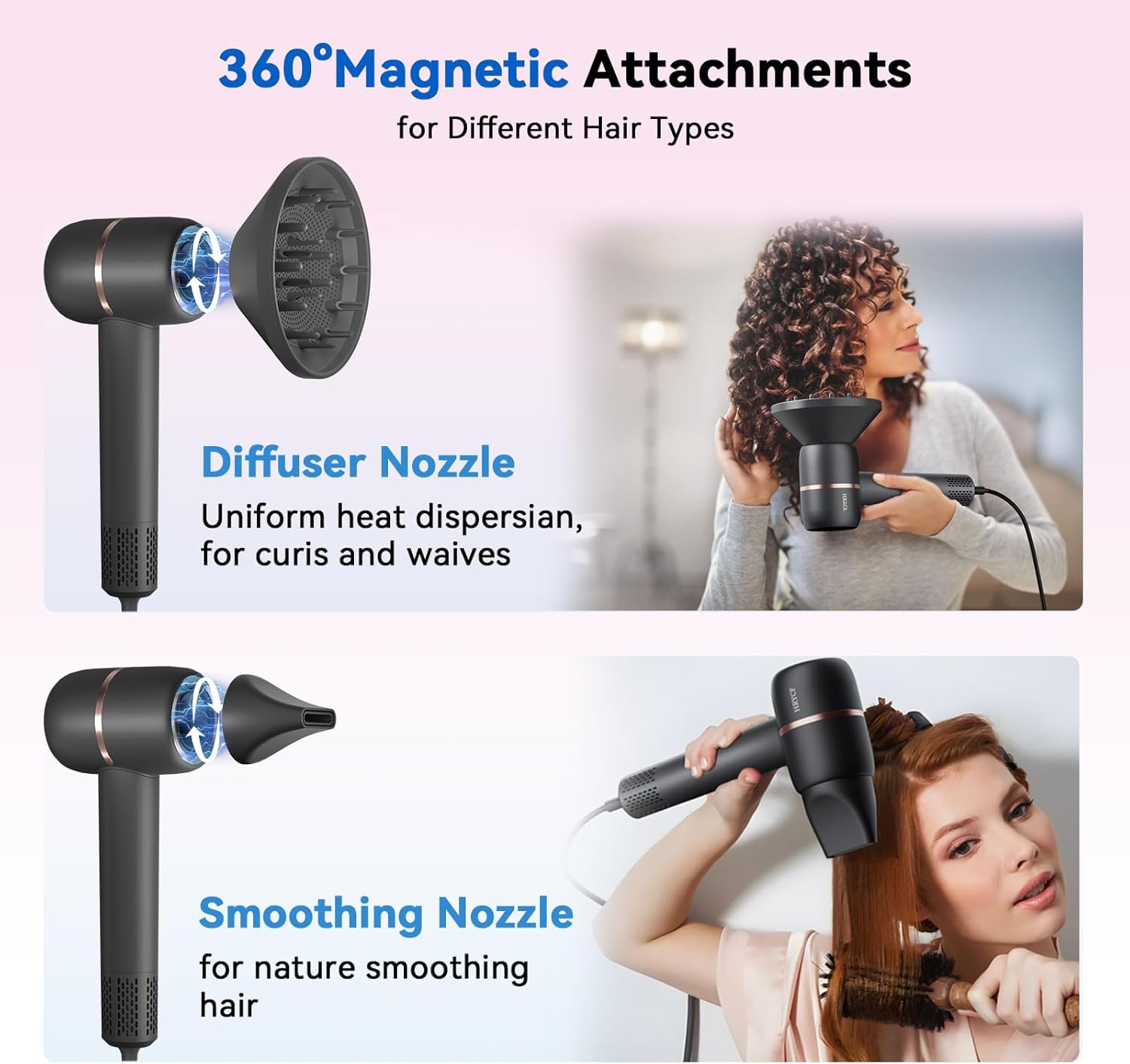 Ionic Hair Dryer Fast Drying, 160000 RPM High-Speed Brushless Motor, Thermo-Control Professional Blow Dryer, Low Noise, Lightweight, Magnetic Concentrator and Diffuser for Curly & Straight Hair, Gray