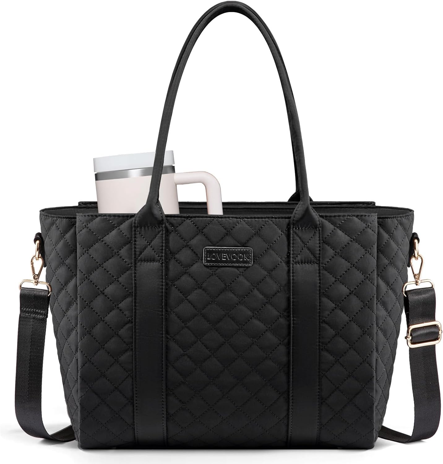 LOVEVOOK Laptop Bag for Women,Work Bag Teacher Tote Bag With Large Cup Holder, Quilted Crossbody bag with Zipper for Travel