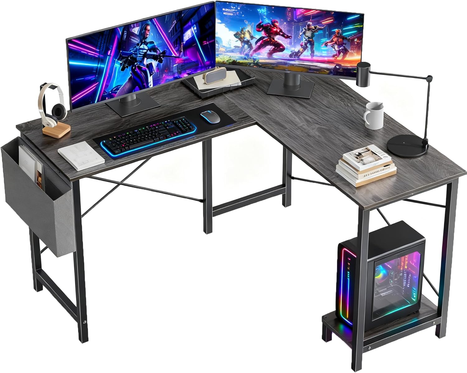 OLIXIS L Shaped Desk, 50-Inch Office Computer Gaming Desks Corner PC Table with Side Bag and Reversible Shelf for Home Work Study Writing Black
