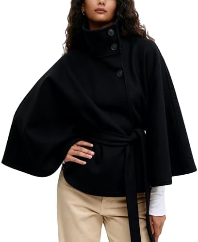 OPCAKM Women's Batwing Sleeve Poncho Coat Oversized Winter Pea Coat Stand Collar Cropped Cape Jacket with Belt