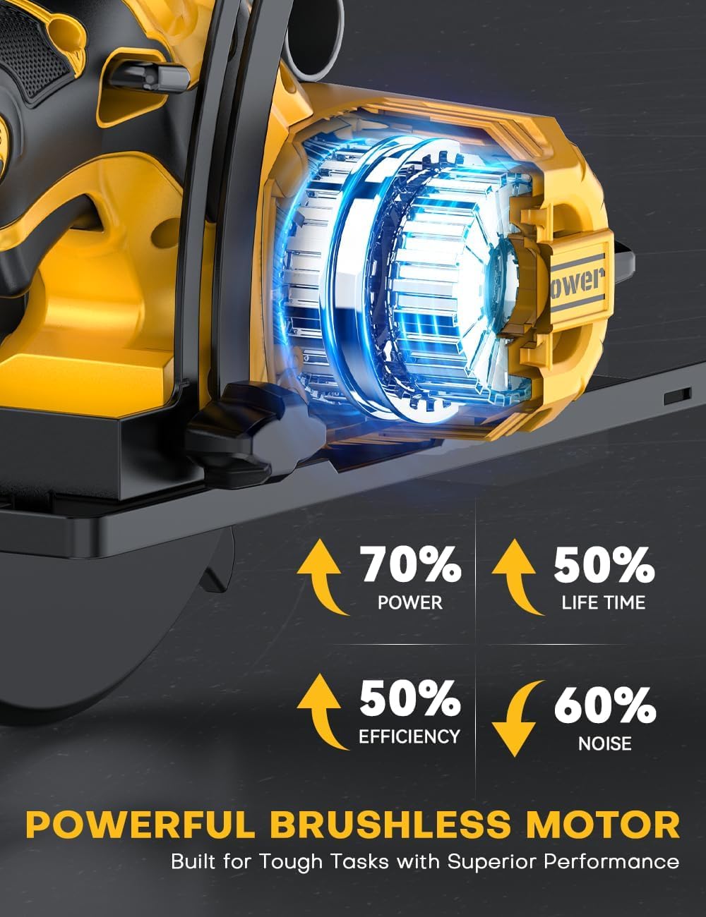 【𝟕𝟎% 𝐁oost 𝐏ower with 𝐁rushless 𝐌otor】Our cordless circular saw is powered by an advanced brushless motor that boosts power by 70%, making tough tasks easier. This motor also extends lifespan by 50%, reducing wear and the need for maintenance. Plus, it cuts noise by 60%, creating a quieter work environment, while improving heat dissipation for long-lasting efficiency and durability.