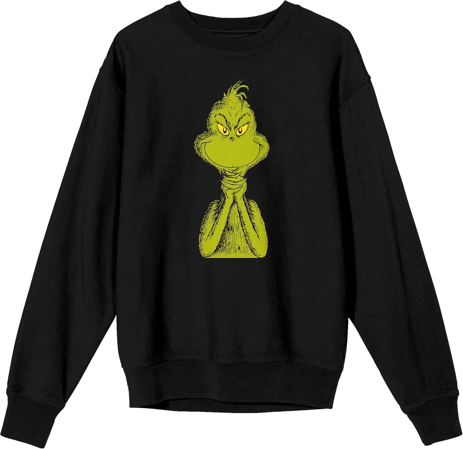 Bring the mischievous charm of Dr. Seuss’s holiday classic to your winter wardrobe with The Grinch Half Body Menacing Smile Men’s Black Crew Neck Long Sleeve Sweatshirt. Featuring a bold graphic of The Grinch’s half-body and his unforgettable smirk, this sweatshirt perfectly blends comfort and holiday spirit. Crafted from a soft, warm cotton-blend fabric, it’s ideal for layering or lounging during the festive season. Whether you’re decking the halls or staying cozy indoors, this sweatshirt is a must-have for any Grinch fan.