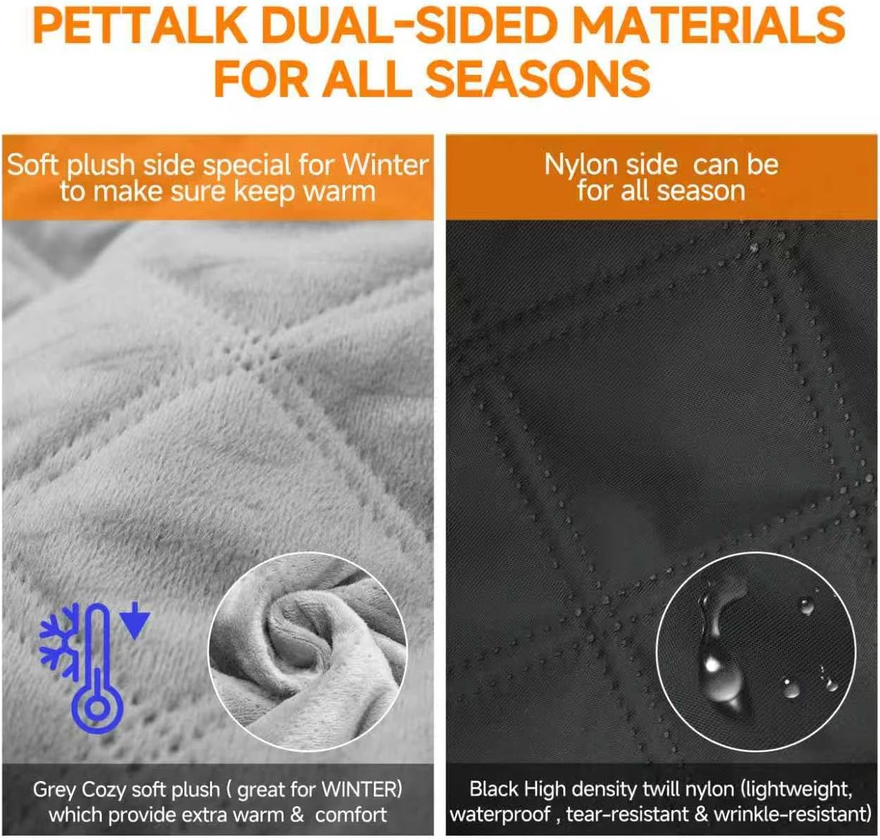 All-Season Comfort—Dual-sided materials design with black high density twill nylon (All season,lightweight, waterproof , tear-resistant & wrinkle-resistant,non-stick pet hair) and reversible grey soft plush (Designed especially for winter, warm & cozy premium velvet) , provides both a comfort and warm side to cater to all seasons. Eco-friendly, resist odors ensure pets and passengers enjoy every ride.