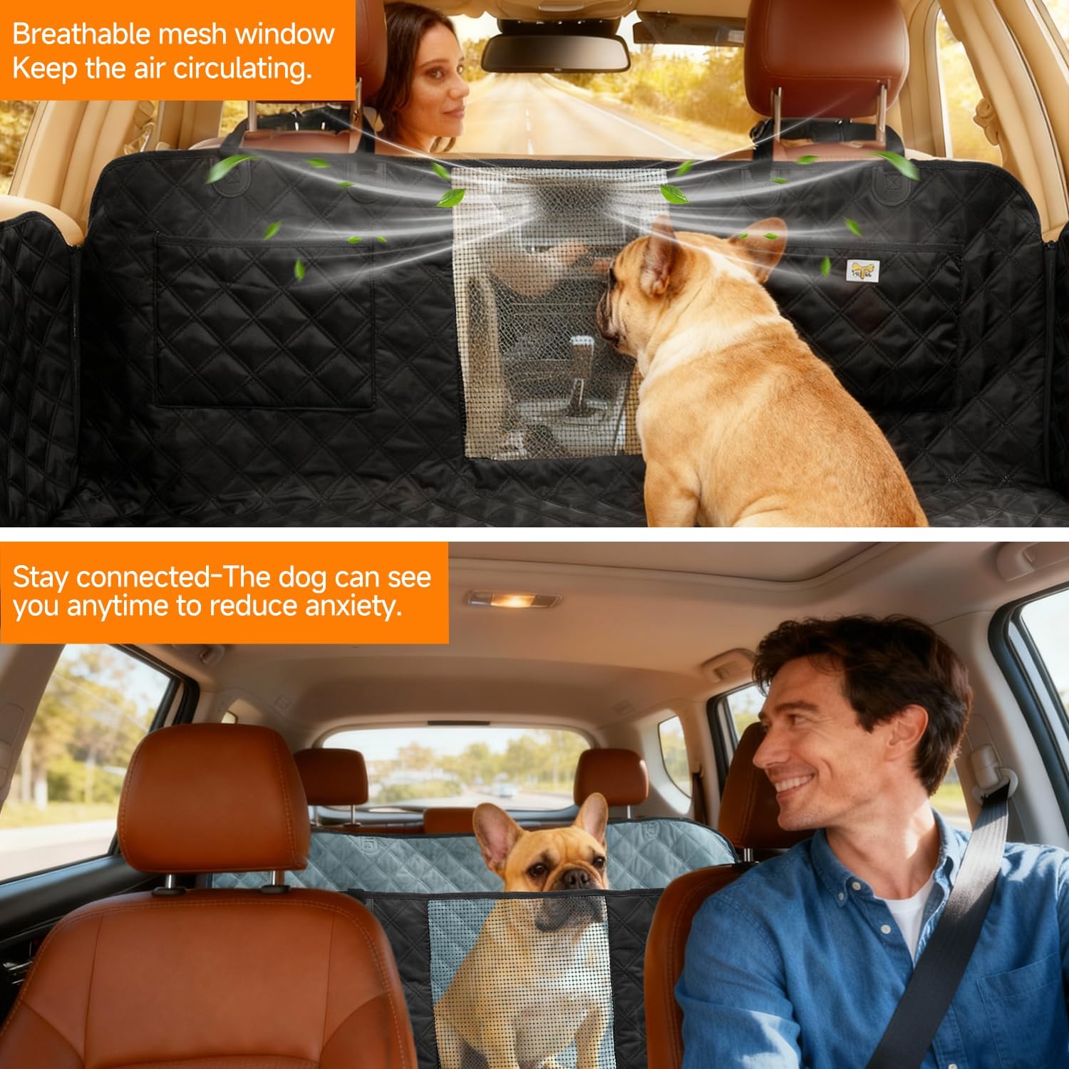 Upgraded Security & Safety—Includes 4 heavy-duty buckles, 2 Velcro anchor pass-throughs, 4 reinforced high density headrest straps, 2 side door guards, high density binding, upgrade zippers, High density mesh window + 2 large volume storage pockets. High density safety restraint keeps pets secure and prevents slipping between seats. Comprehensive protection for the car interior and the dog's safety.