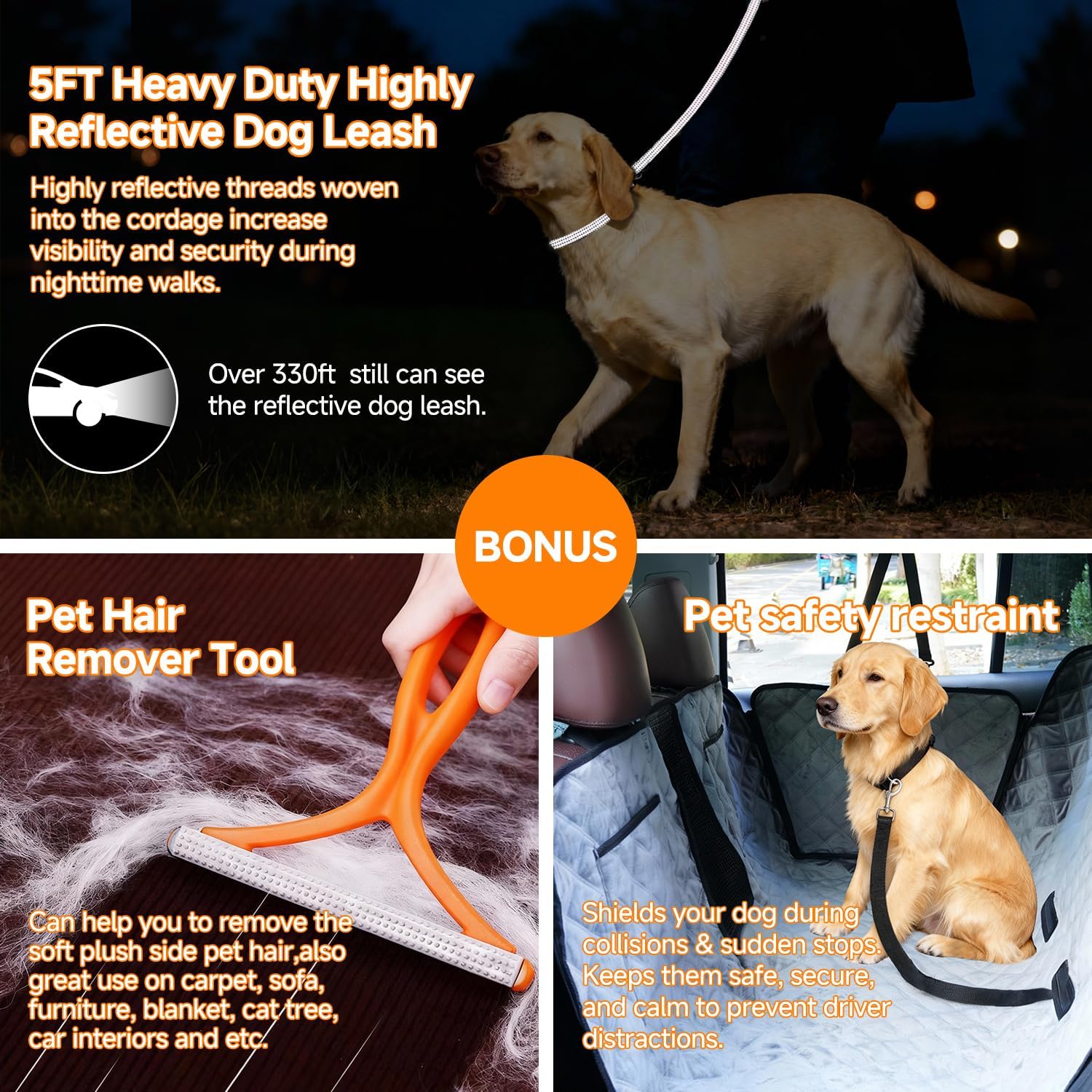 User Friendly Bonus Bundle Included! - 1 x 5ft Heavy Duty Highly Reflective Dog Leash (Highly reflective threads woven into the cordage increase visibility and security during nighttime walks; visible over 330ft). - 1 x Pet Hair Remover Tool (Helps remove pet hair from the soft plush side, and is also great for use on carpets, sofas, furniture, blankets, car interiors, etc.). - 1 x Pet Safety Restraint with High Density Strap (Shields your dog during collisions & sudden stops; keeps them safe, secure, and calm to prevent driver distractions).