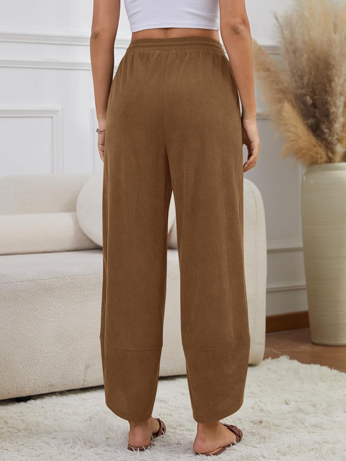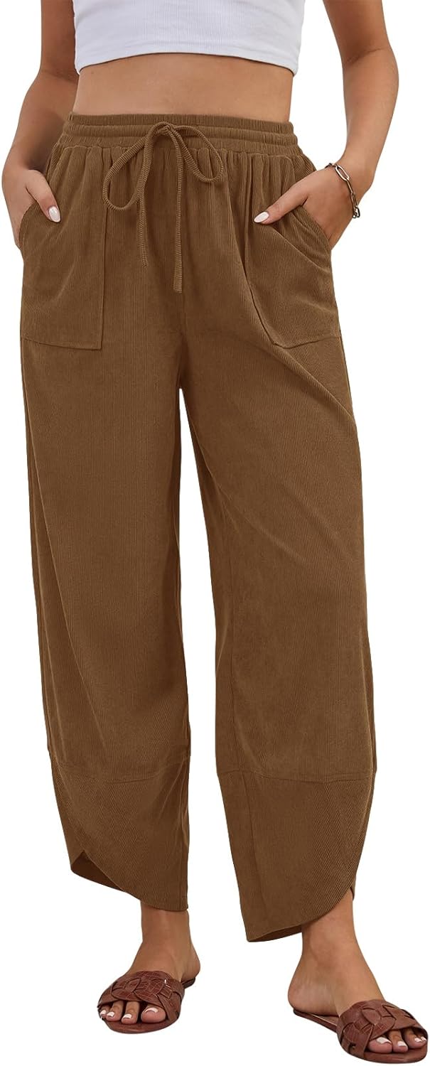 Grewley Corduroy Pants for Women Casual Wide Leg Pants Womens Barrel Pants Baggy Trousers Drawstring Elastic with Pockets Grewley Womens Corduroy Pants Casual Wide Leg Pants Trousers Palazzo Harem Pants for Women Drawstring Fall Pants 【Corduroy Fabric】Casual womens corduroy pants are made from high-quality materials, offering a soft and breathable feel. The skin-friendly material perfect for spring,fall and winter, providing you with the ideal blend of style and coziness. 【Features】These baggy harem pants feature two side pockets, an adjustable drawstring elastic waistband, and a stylish wrap design at hem. The loose-fitting silhouette flatters all body types and is an excellent option for pregnant women who want comfort without sacrificing style. Easily pair with crop tops, tanks, or tees for a casual look, cardigans, or sweaters, to create a trendy and fashionable look. 【Occasion】These palazzo corduroy wide leg pants are perfect for a variety of occasions, including lounging at home or wearing out casually,work, shopping, jogging, running, vacations, holidays, outdoor activities, and everyday wear. Ideal for spring, and fall, they offer both trendy style and comfort wherever you go. palazzo pants for women,womens corduroy pants,black corduroy pants, brown corduroy pants for woman,green corduroy pants,khaki corduroy pants,free people pants,harem pants women with pockets Care Instructions: 1.Use a mesh laundry bag, Machine Wash Gentle in Cold Water; 2.Lay Flat to Dry; 3.Steam Iron (to remove wrinkles) Size Guide : S: Waist- 27.6"; Hips- 40.2"; Length- 36.6" M: Waist- 29.5"; Hips- 42.1"; Length-37.3" L: Waist- 32.3"; Hips- 45.1"; Length- 38.1" XL: Waist- 35.0"; Hips- 48.1"; Length- 38.9" XXL: Waist- 37.8"; Hips- 51.1"; Length- 39.6" Please allow 1 inch/2cm difference due to hand measurement.