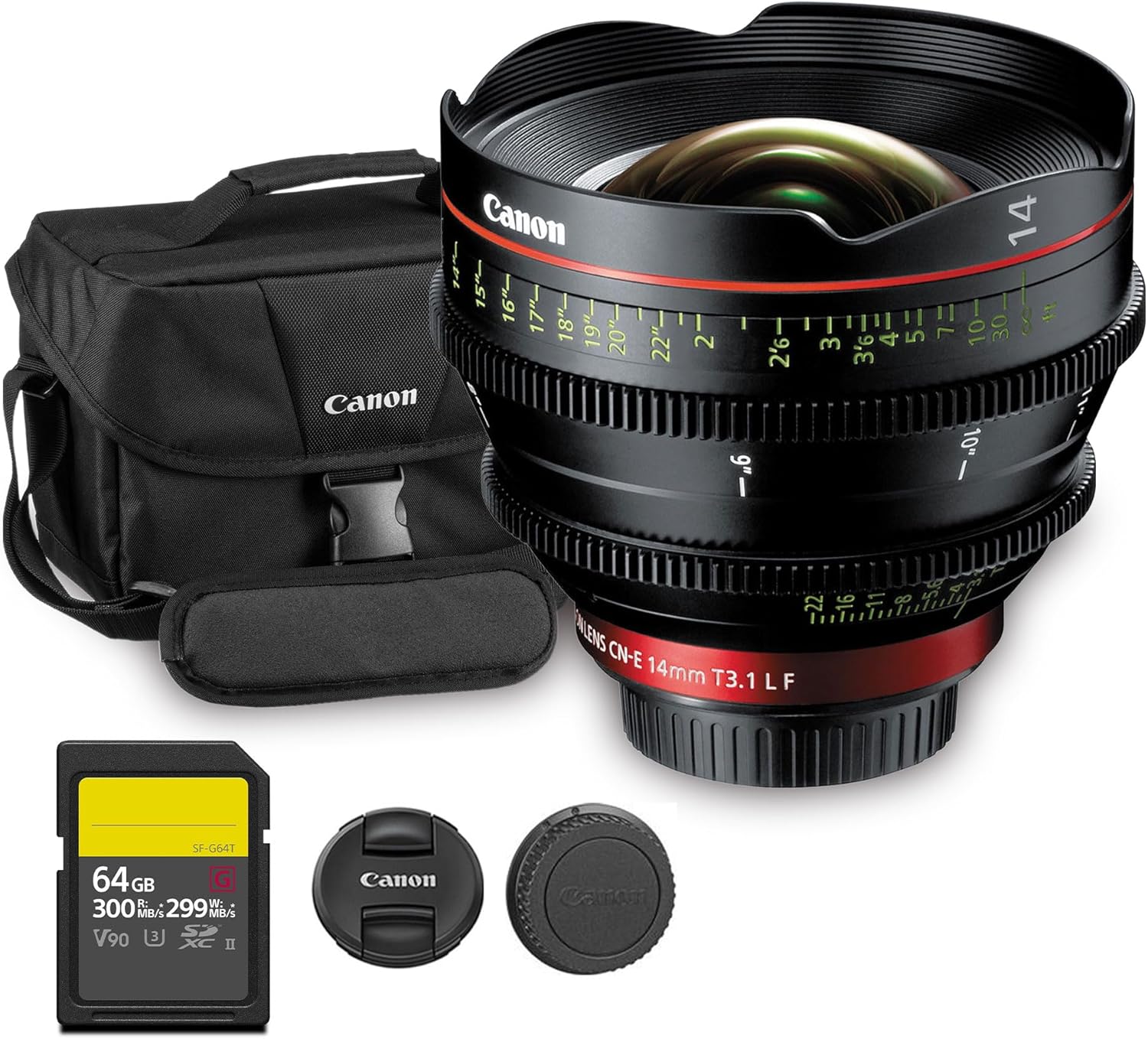 Canon USA Authorized. Items Include: Canon CN-E 14mm T3.1 L F Cinema Prime Lens (EF Mount), Canon EOS 200ES Shoulder Bag, 64GB SF-G TOUGH Series UHS-II SDXC Memory Card